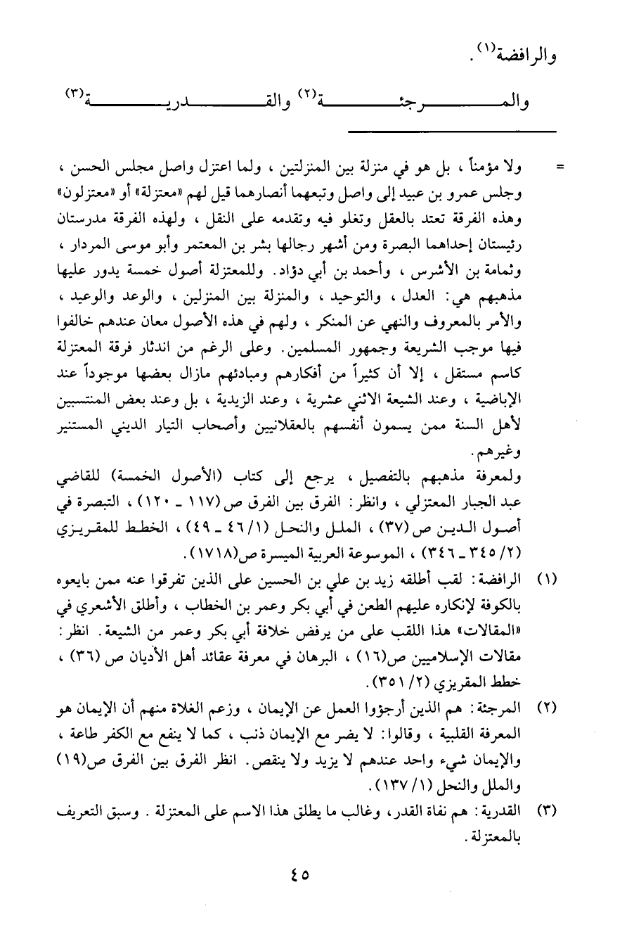 (¬1) الرافضة: لقب أطلقه زيد بن علي بن الحسين على الذين تفرقوا عنه ممن بايعوه بالكوفة لإنكاره عليهم الطعن في أبي بكر وعمر بن الخطاب، وأطلق الأشعري في" المقالات" هذا اللقب على من يرفض خلافة أبي بكر وعمر من الشيعة. انظر: مقالات الإسلاميين، ص (16) ، البرهان في معرفة عقائد أهل الأديان ص (36) ، خطط المقريزي (2/351) ..