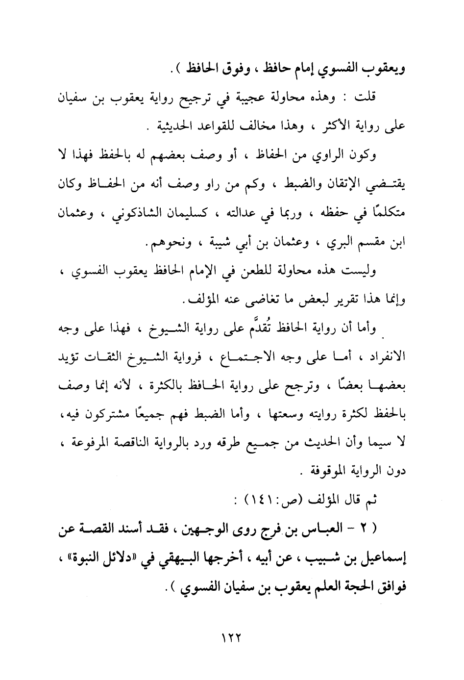 وليست هذه محاولة للطعن في الإمام الحافظ يعقوب الفسوي، وإنما هذا تقرير لبعض ما تغاضى عنه المؤلف.