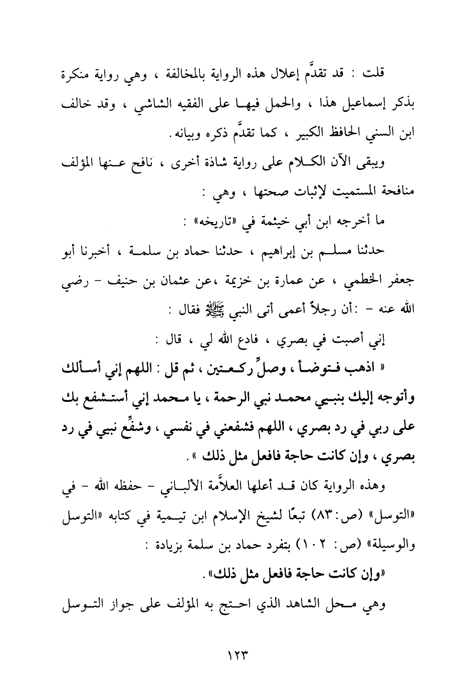 وهذه الرواية كان قد أعلها العلَّامة الألباني - حفظه الله - في "التوسل" (ص: ٨٣) تبعًا لشيخ الإسلام ابن تيمية في كتابه "التوسل والوسيلة" (ص: ١٠٢) بتفرد حماد بن سلمة بزيادة: