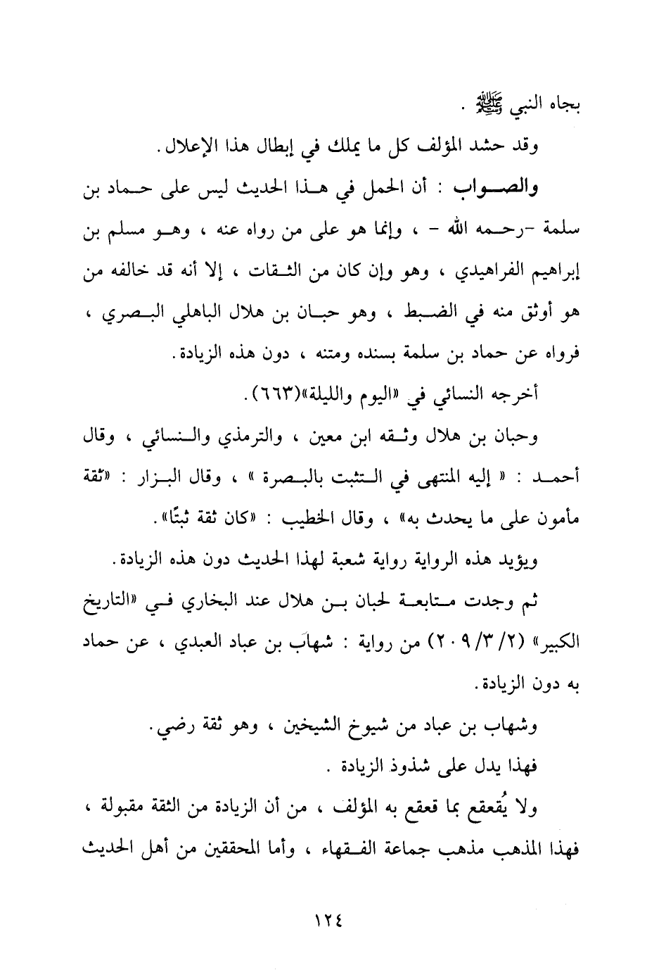 والصواب: أن الحمل في هذا الحديث ليس على حماد بن سلمة - رحمه الله -، وإنما هو على من رواه عنه، وهو مسلم بن إبراهيم الفراهيدي، وهو وإن كان من الثقات، إلا أنه قد خالفه من هو أوثق منه في الضبط، وهو حبان بن هلال الباهلي البصري، فرواه عن حماد بن سلمة بسنده ومتنه، دون هذه الزيادة.