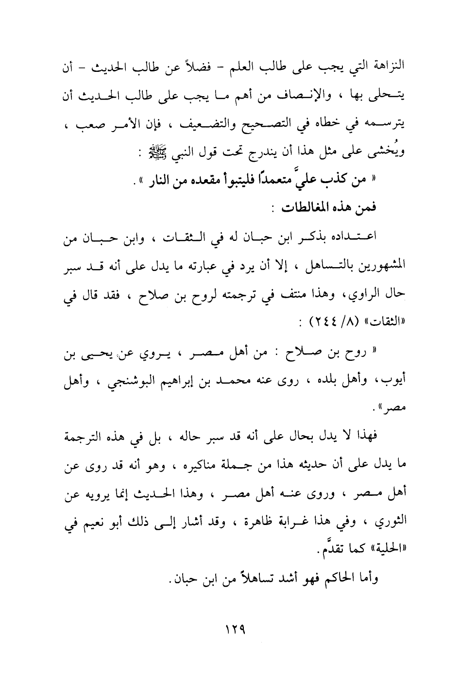اعتداده بذكر ابن حبان له في الثقات، وابن حبان من المشهورين بالتساهل، إلا أن يرد في عبارته ما يدل على أنه قد سبر حال الراوي، وهذا منتف في ترجمته لروح بن صلاح، فقد قال في "الثقات" (٨/ ٢٤٤):