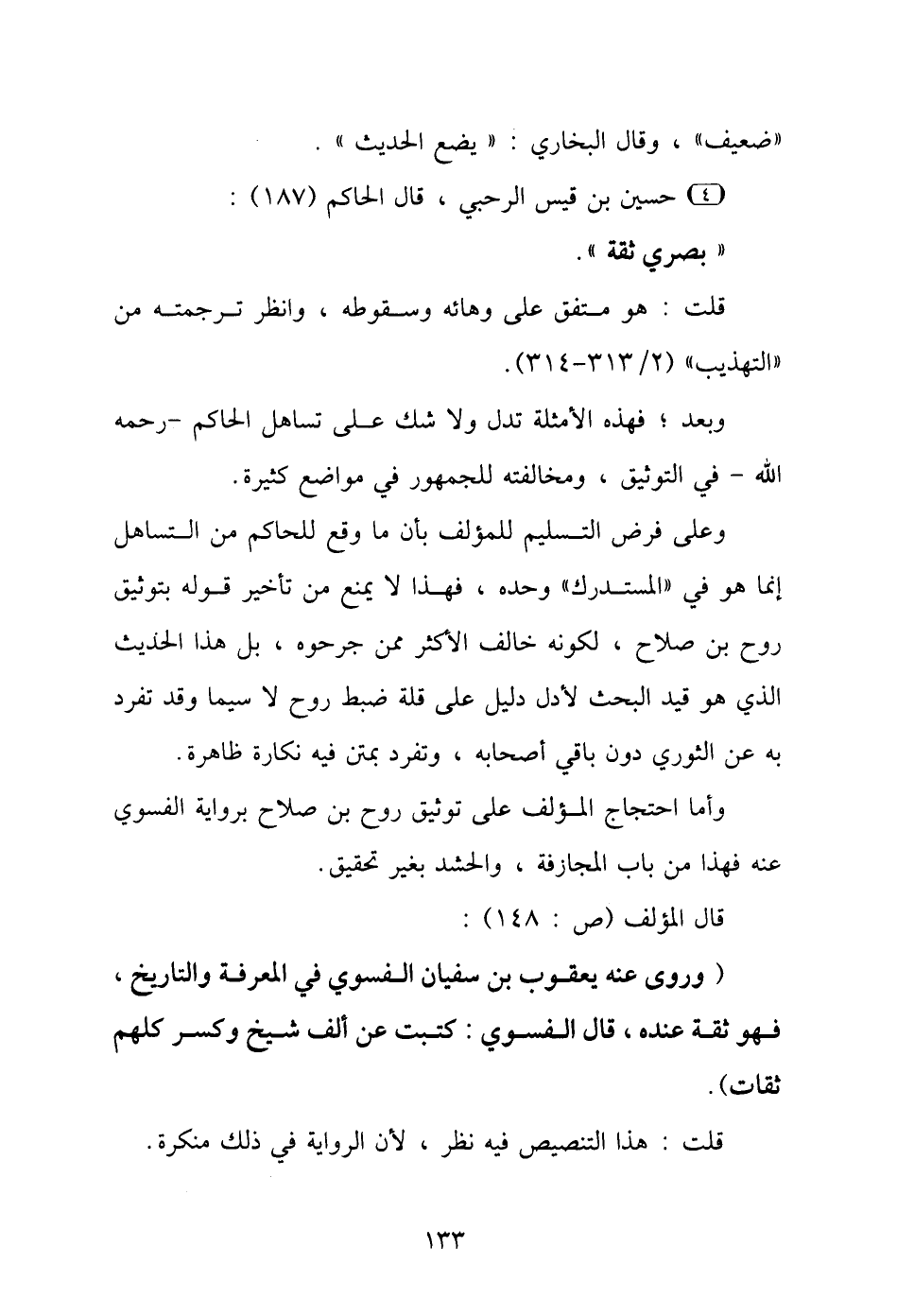 وعلى فرض التسليم للمؤلف بأن ما وقع للحاكم من التساهل إنما هو في "المستدرك" وحده، فهذا لا يمنع من تأخير قوله بتوثيق روح بن صلاح، لكونه خالف الأكثر ممن جرحوه، بل هذا الحديث الذي هو قيد البحث لأدل دليل على قلة ضبط روح لا سيما وقد تفرد به عن الثوري دون باقي أصحابه، وتفرد بمتن فيه نكارة ظاهرة.