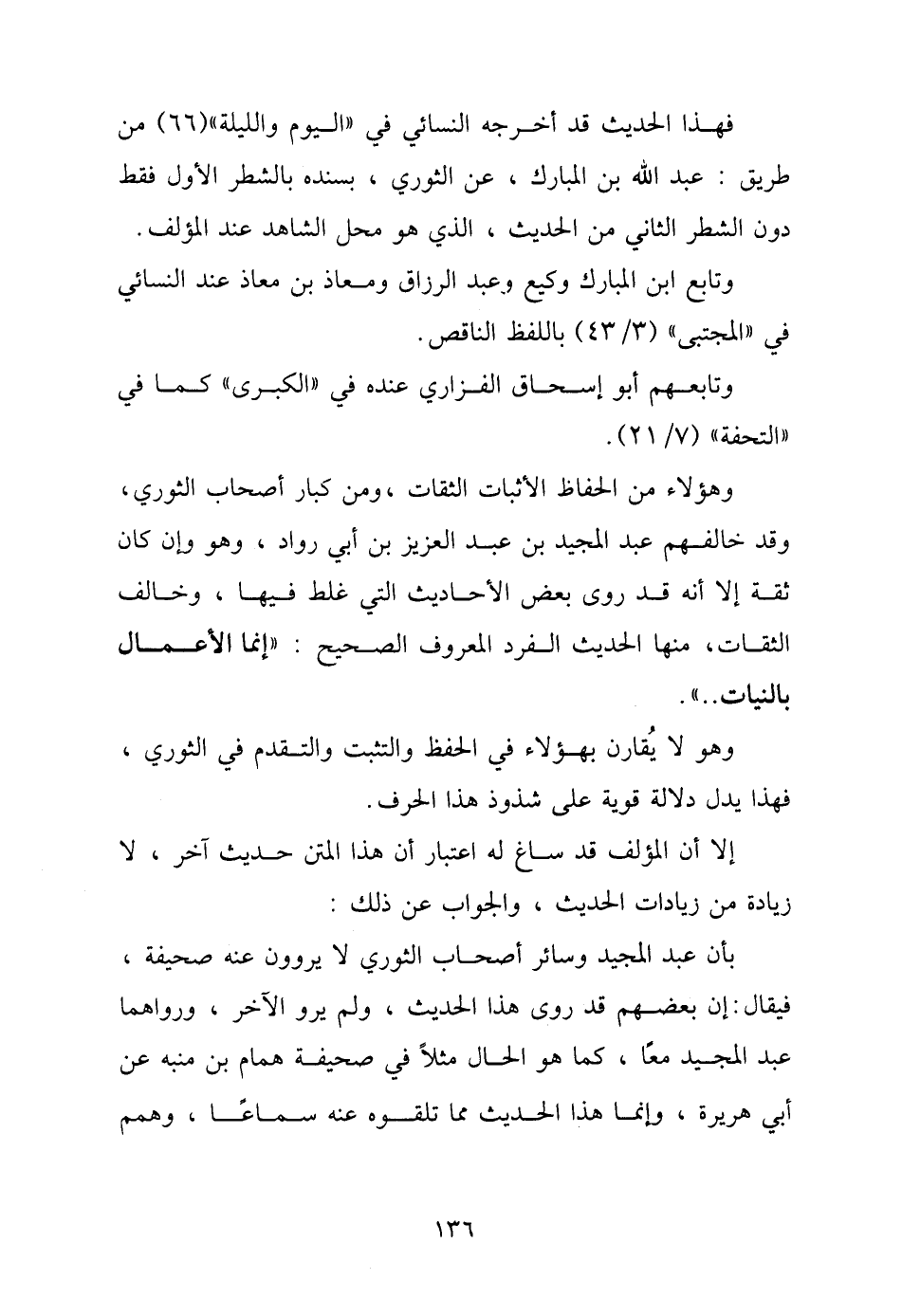 وهؤلاء من الحفاظ الأثبات الثقات، ومن كبار أصحاب الثوري، وقد خالفهم عبد المجيد بن عبد العزيز بن أبي رواد، وهو وإن كان ثقة إلا أنه قد روى بعض الأحاديث التي غلط فيها، وخالف الثقات، منها الحديث الفرد المعروف الصحيح: "إنما الأعمال بالنيات .. ".