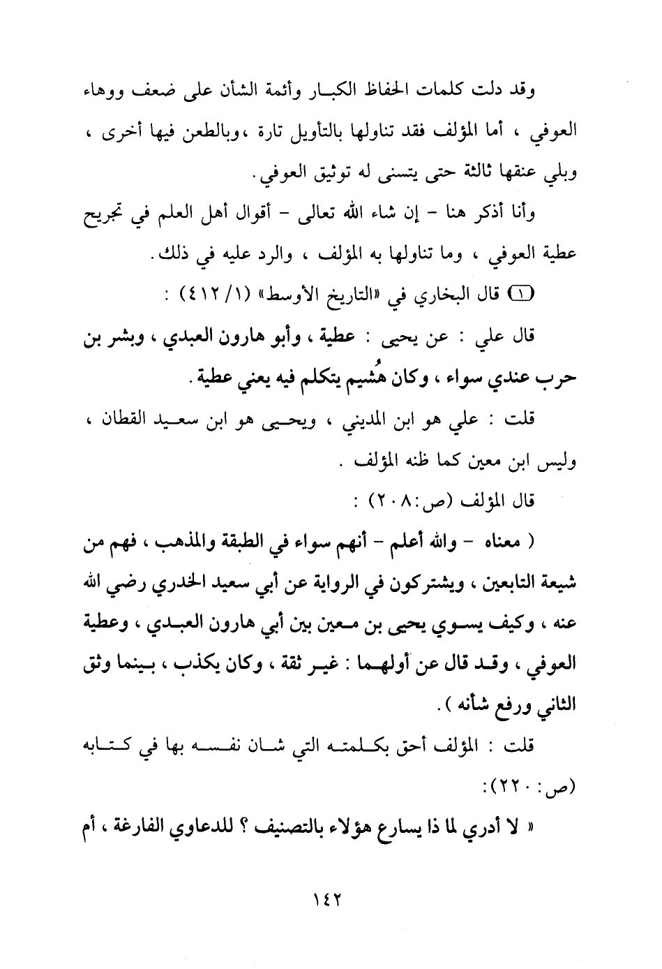 وقد دلت كلمات الحفاظ الكبار وأئمة الشأن على ضعف ووهاء العوفي، أما المؤلف فقد تناولها بالتأويل تارة، وبالطعن فيها أخرى، وبلي عنقها ثالثة حتى يتسنى له توثيق العوفي.
