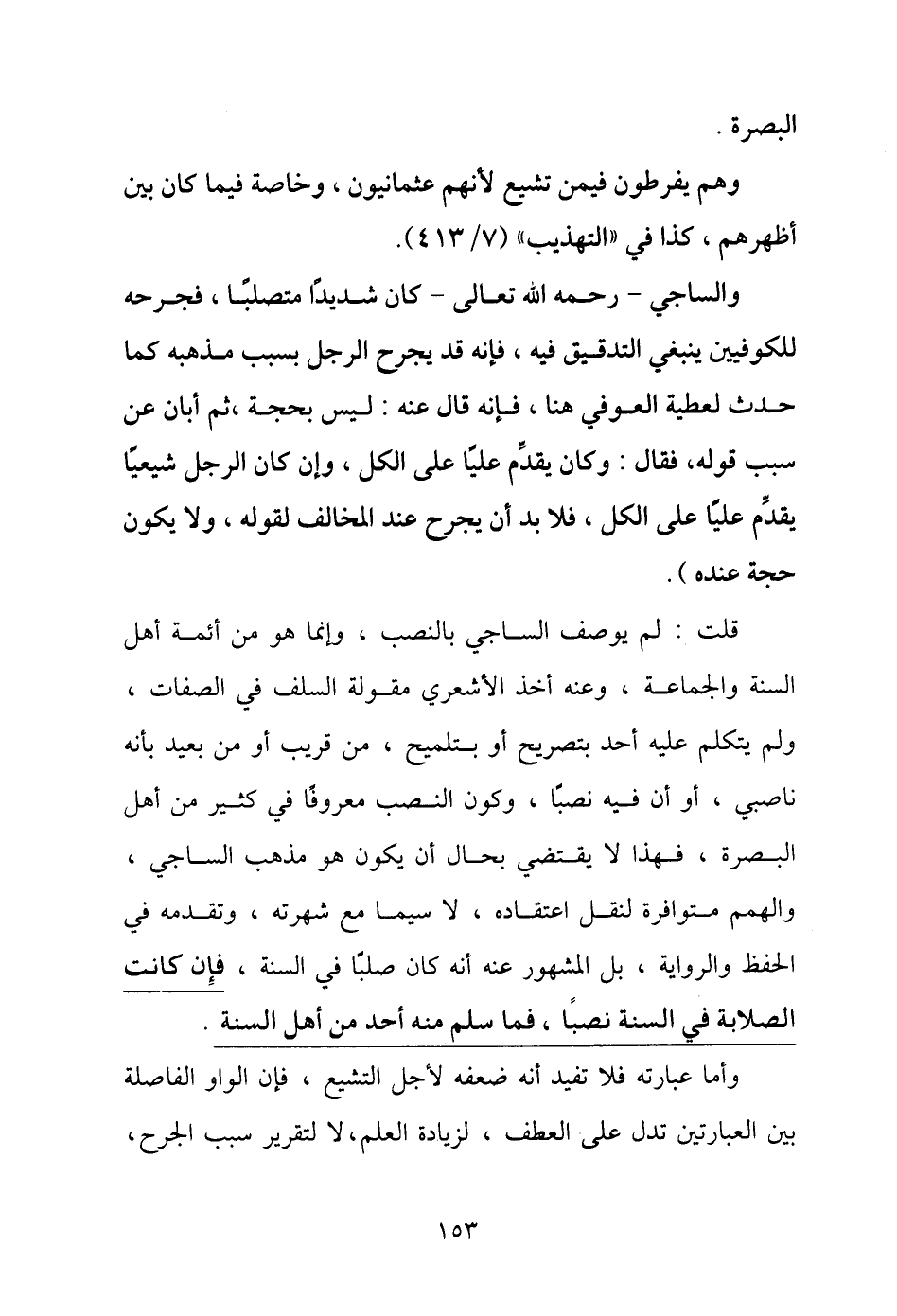 قلت: لم يوصف الساجي بالنصب، وإنما هو من أئمة أهل السنة والجماعة، وعنه أخذ الأشعري مقولة السلف في الصفات، ولم يتكلم عليه أحد بتصريح أو بتلميح، من قريب أو من بعيد بأنه ناصبي، أو أن فيه نصبًا، وكون النصب معروفًا في كثير من أهل البصرة، فهذا لا يقتضي بحال أن يكون هو مذهب الساجي، والهمم متوافرة لنقل اعتقاده، لا سيما مع شهرته، وتقدمه في الحفظ والرواية، بل المشهور عنه أنه كان صلبًا في السنة، فإِن كانت الصلابة في السنة نصبًا، فما سلم منه أحد من أهل السنة.