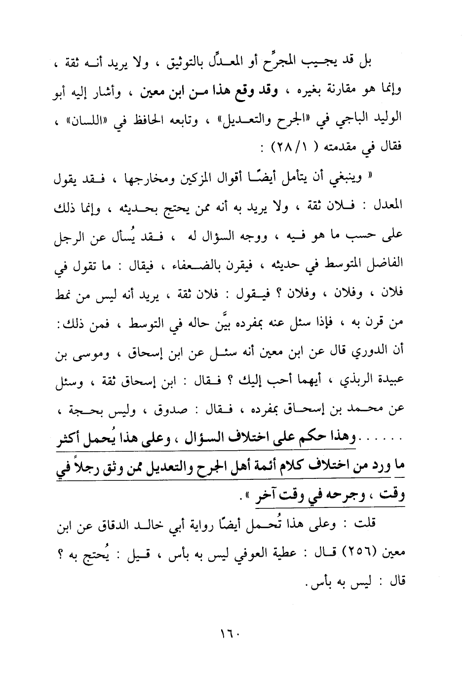 بل قد يجيب المجرِّح أو المعدِّل بالتوثيق، ولا يريد أنه ثقة، وإنما هو مقارنة بغيره، وقد وقع هذا من ابن معين، وأشار إليه أبو الوليد الباجي في "الجرح والتعديل"، وتابعه الحافظ في "اللسان"، فقال في مقدمته (١/ ٢٨):