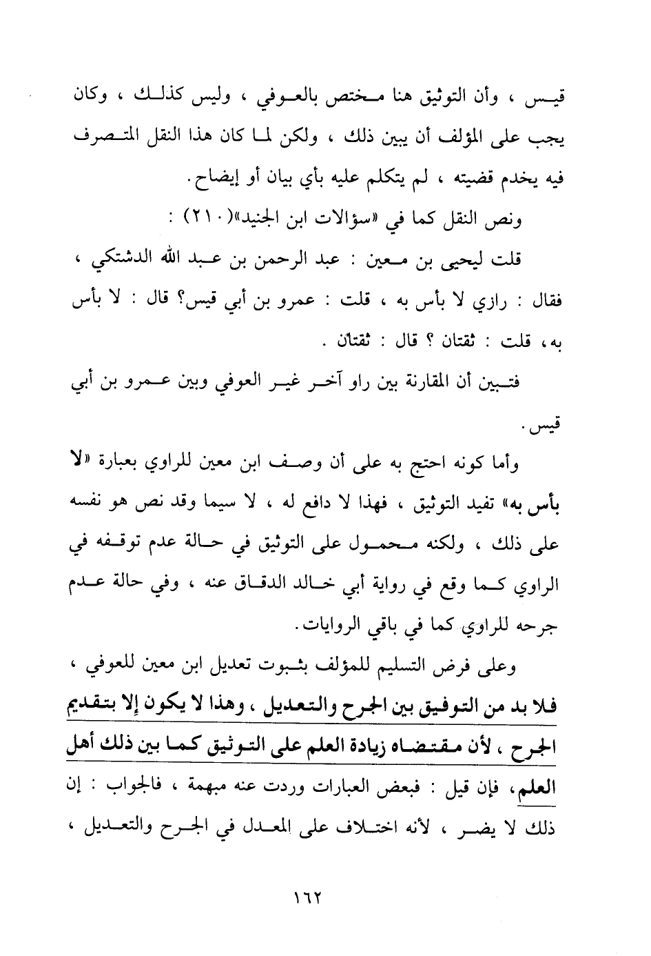 وعلى فرض التسليم للمؤلف بثبوت تعديل ابن معين للعوفي، فلا بد من التوفيق بين الجرح والتعديل، وهذا لا يكون إِلا بتقديم الجرح، لأن مقتضاه زيادة العلم على التوثيق كما بين ذلك أهل العلم، فإن قيل: فبعض العبارات وردت عنه مبهمة، فالجواب: إن ذلك لا يضر، لأنه اختلاف على المعدل في الجرح والتعديل،