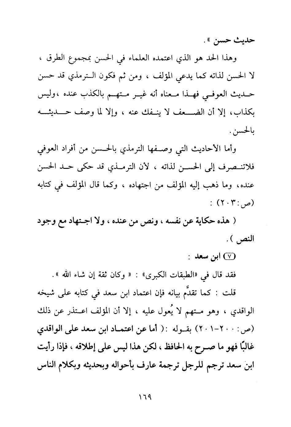 وأما الأحاديث التي وصفها الترمذي بالحسن من أفراد العوفي فلا تنصرف إلى الحسن لذاته، لأن الترمذي قد حكى حد الحسن عنده، وما ذهب إليه المؤلف من اجتهاده، وكما قال المؤلف في كتابه (ص: ٢٠٣):