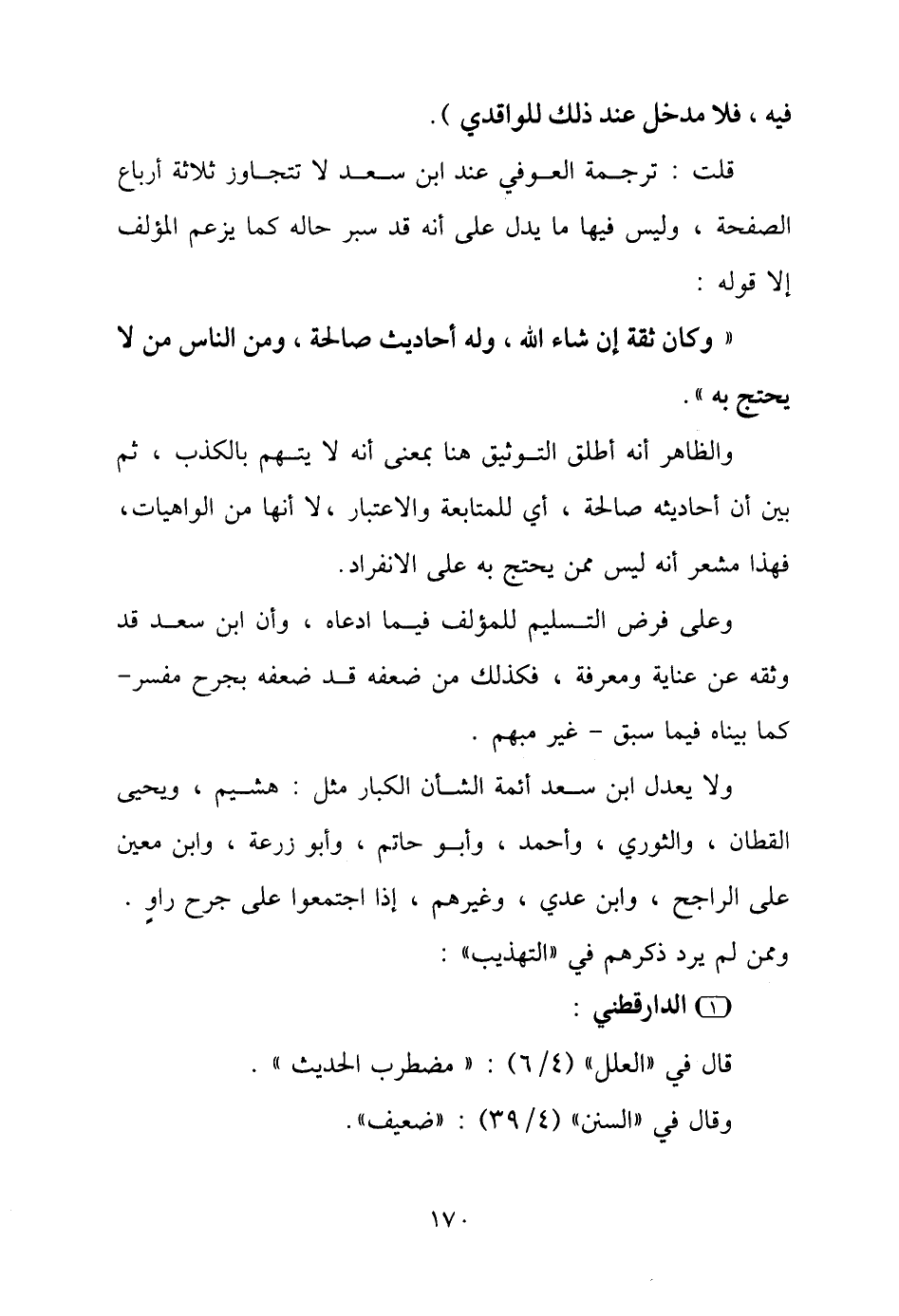 وعلى فرض التسليم للمؤلف فيما ادعاه، وأن ابن سعد قد وثقه عن عناية ومعرفة، فكذلك من ضعفه قد ضعفه بجرح مفسر - كما بيناه فيما سبق - غير مبهم.