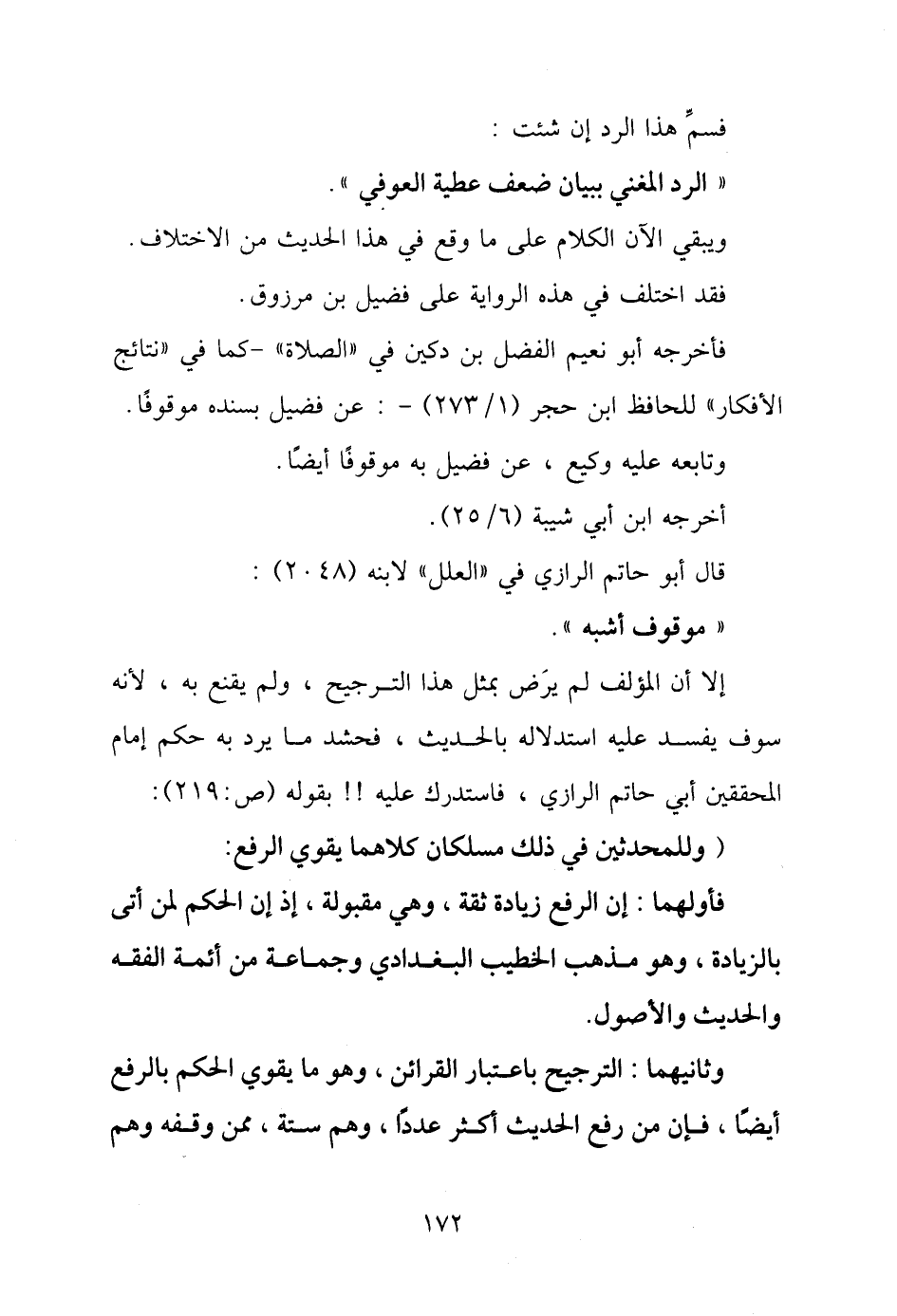إلا أن المؤلف لم يرضَ بمثل هذا الترجيح، ولم يقنع به، لأنه سوف يفسد عليه استدلاله بالحديث، فحشد ما يرد به حكم إمام المحققين أبي حاتم الرازي، فاستدرك عليه! ! بقوله (ص: ٢١٩):