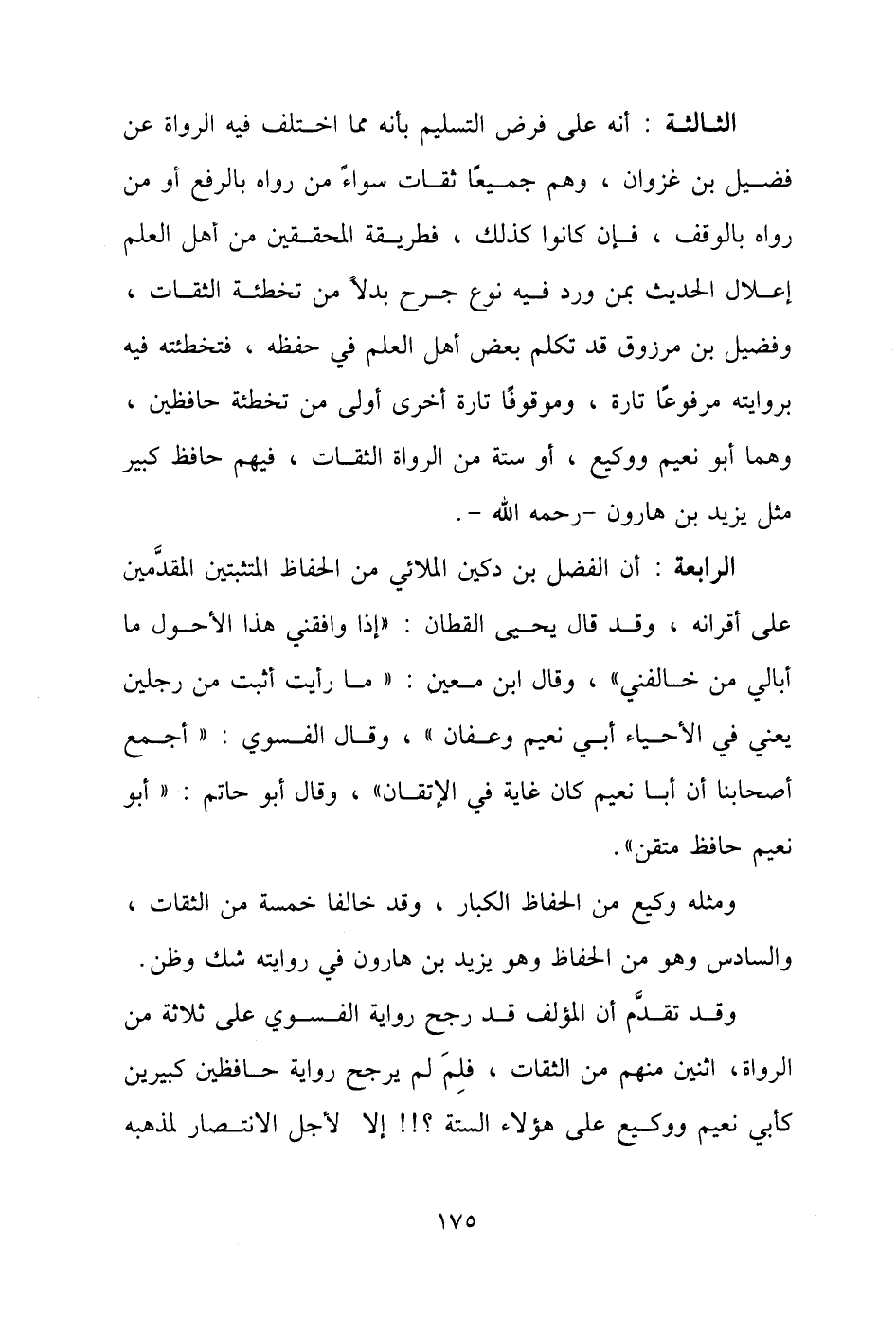 الرابعة: أن الفضل بن دكين الملائي من الحفاظ المتثبتين المقدَّمين على أقرانه، وقد قال يحيى القطان: "إذا وافقني هذا الأحول ما أبالي من خالفني"، وقال ابن معين: "ما رأيت أثبت من رجلين يعني في الأحياء أبي نعيم وعفان"، وقال الفسوي: "أجمع أصحابنا أن أبا نعيم كان غاية في الإتقان"، وقال أبو حاتم: "أبو نعيم حافظ متقن".