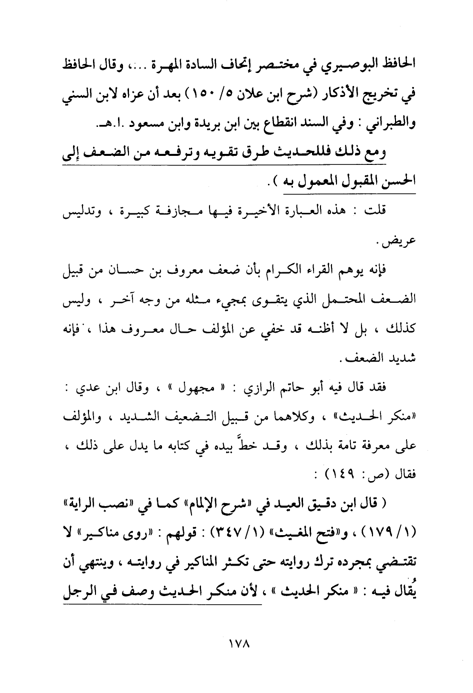 (قال ابن دقيق العيد في "شرح الإلمام" كما في "نصب الراية" (١/ ١٧٩)، و"فتح المغيث" (١/ ٣٤٧): قولهم: "روى مناكير" لا تقتضي بمجرده ترك روايته حتى تكثر المناكير في روايته، وينتهي أن يُقال فيه: "منكر الحديث"، لأن منكر الحديث وصف في الرجل