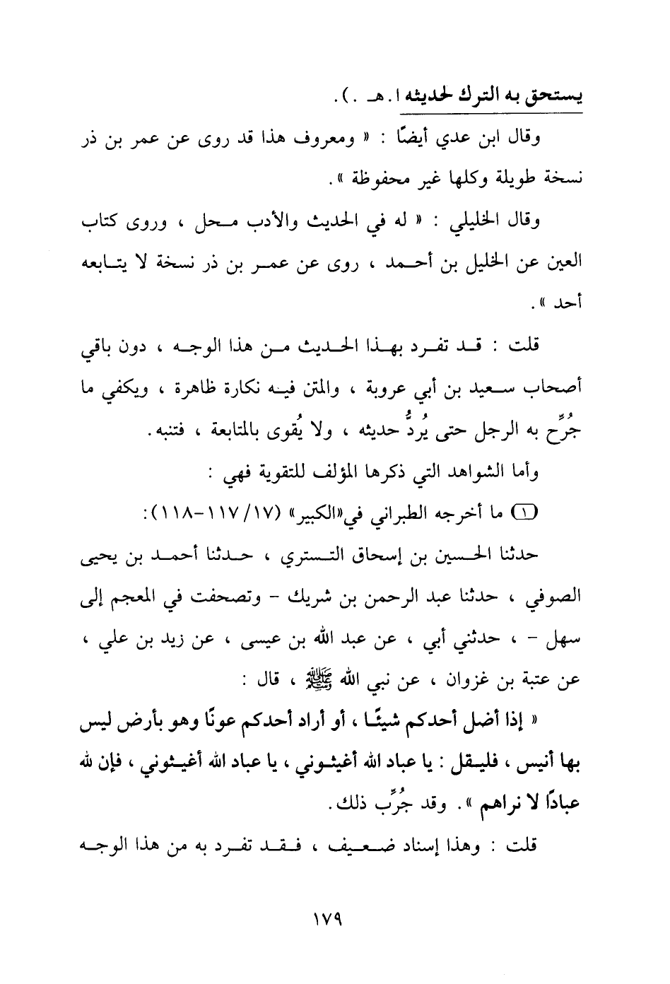 حدثنا الحسين بن إسحاق التستري، حدثنا أحمد بن يحيى الصوفي، حدثنا عبد الرحمن بن شريك - وتصحفت في المعجم إلى سهل -، حدثني أبي، عن عبد الله بن عيسى، عن زيد بن علي، عن عتبة بن غزوان، عن نبي الله - صلى الله عليه وسلم -، قال: "إذا أضل أحدكم شيئًا، أو أراد أحدكم عونًا وهو بأرض ليس بها أنيس، فليقل: يا عباد الله أغيثوني، يا عباد الله أغيثوني، فإن لله عبادًا لا نراهم". وقد جُرِّب ذلك.