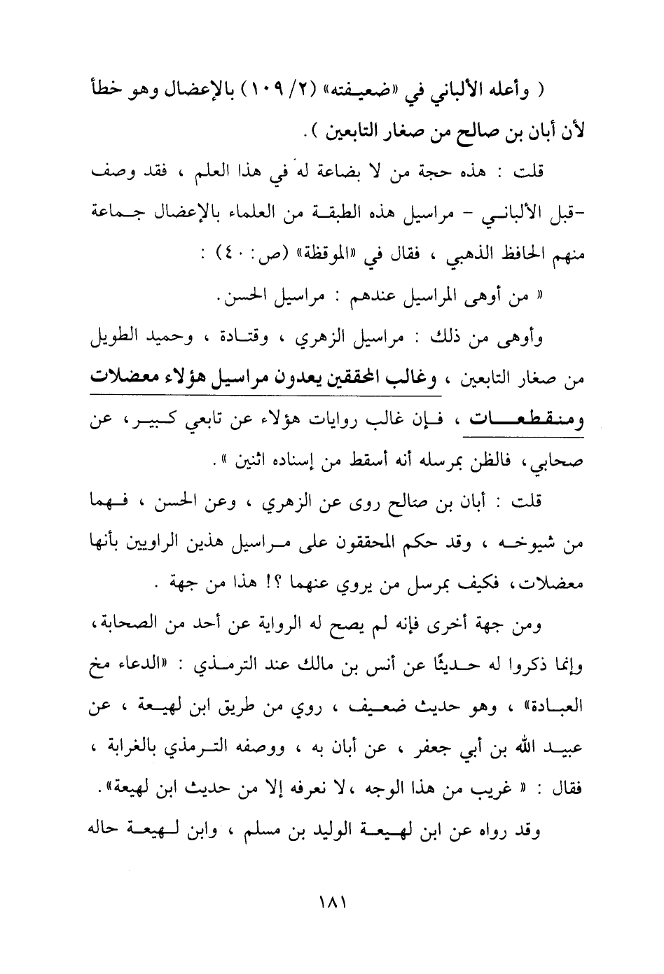 قلت: هذه حجة من لا بضاعة له في هذا العلم، فقد وصف - قبل الألباني - مراسيل هذه الطبقة من العلماء بالإعضال جماعة منهم الحافظ الذهبي، فقال في "الموقظة" (ص: ٤٠):