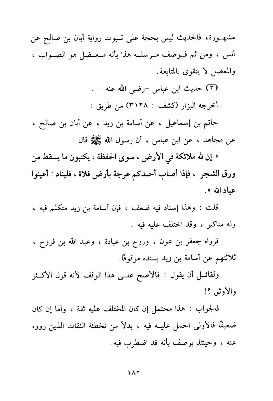 "إن لله ملائكة في الأرض، سوى الحفظة، يكتبون ما يسقط من ورق الشجر، فإذا أصاب أحدكم عرجة بأرض فلاة، فليناد: أعينوا عباد الله".