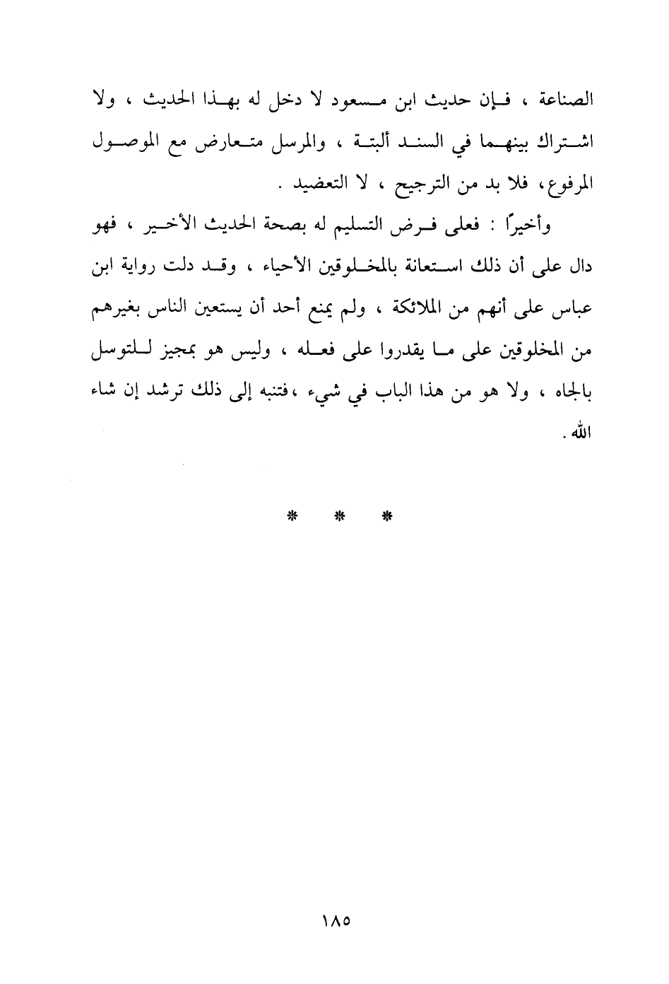 وأخيرًا: فعلى فرض التسليم له بصحة الحديث الأخير، فهو دال على أن ذلك استعانة بالمخلوقين الأحياء، وقد دلت رواية ابن عباص على أنهم من الملائكة، ولم يمنع أحد أن يستعين الناس بغيرهم من المخلوقين على ما يقدروا على فعله، وليس هو بمجيز للتوسل بالجاه، ولا هو من هذا الباب في شيء، فتنبه إلى ذلك ترشد إن شاء الله.