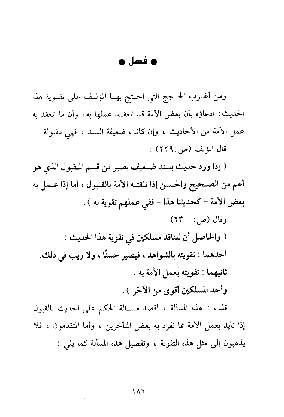 قلت: هذه المسألة، أقصد مسألة الحكم على الحديث بالقبول إذا تأيد بعمل الأمة مما تفرد به بعض المتأخرين، وأما المتقدمون، فلا يذهبون إلى مثل هذه التقوية، وتفصيل هذه المسألة كما يلي: