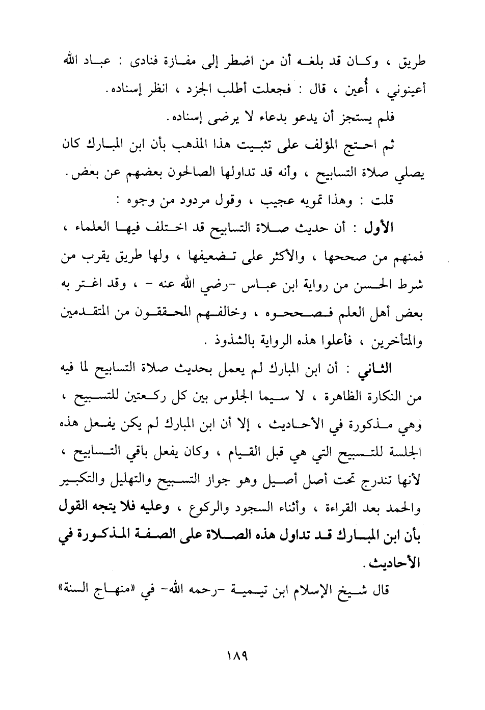 ثم احتج المؤلف على تثبيت هذا المذهب بأن ابن المبارك كان يصلي صلاة التسابيح، وأنه قد تداولها الصالحون بعضهم عن بعض.