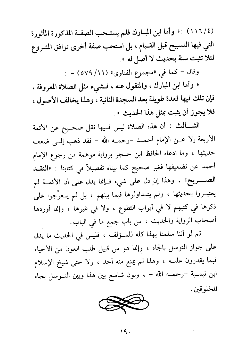 الثالث: أن هذه الصلاة ليس فيها نقل صحيح عن الأئمة الأربعة إلا عن الإمام أحمد - رحمه الله - فقد ذهب إلى ضعف حديثها، وما ادعاه الحافظ ابن حجر برواية موهمة من رجوع الإمام أحمد عن تضعيفها فغير صحيح كما بيناه تفصيلًا في كتابنا: "النقد الصريح"، وهذا إن دل على شيء فإنما يدل على أن الأئمة لم يعتبروا بحديثها، ولم يتداولوها فيما بينهم، بل لم يعرِّجوا على ذكرها في كتبهم لا في أبواب التطوع، ولا في غيرها، وإنما أوردها أصحاب الرواية والحديث، من باب جمع ما في الباب.