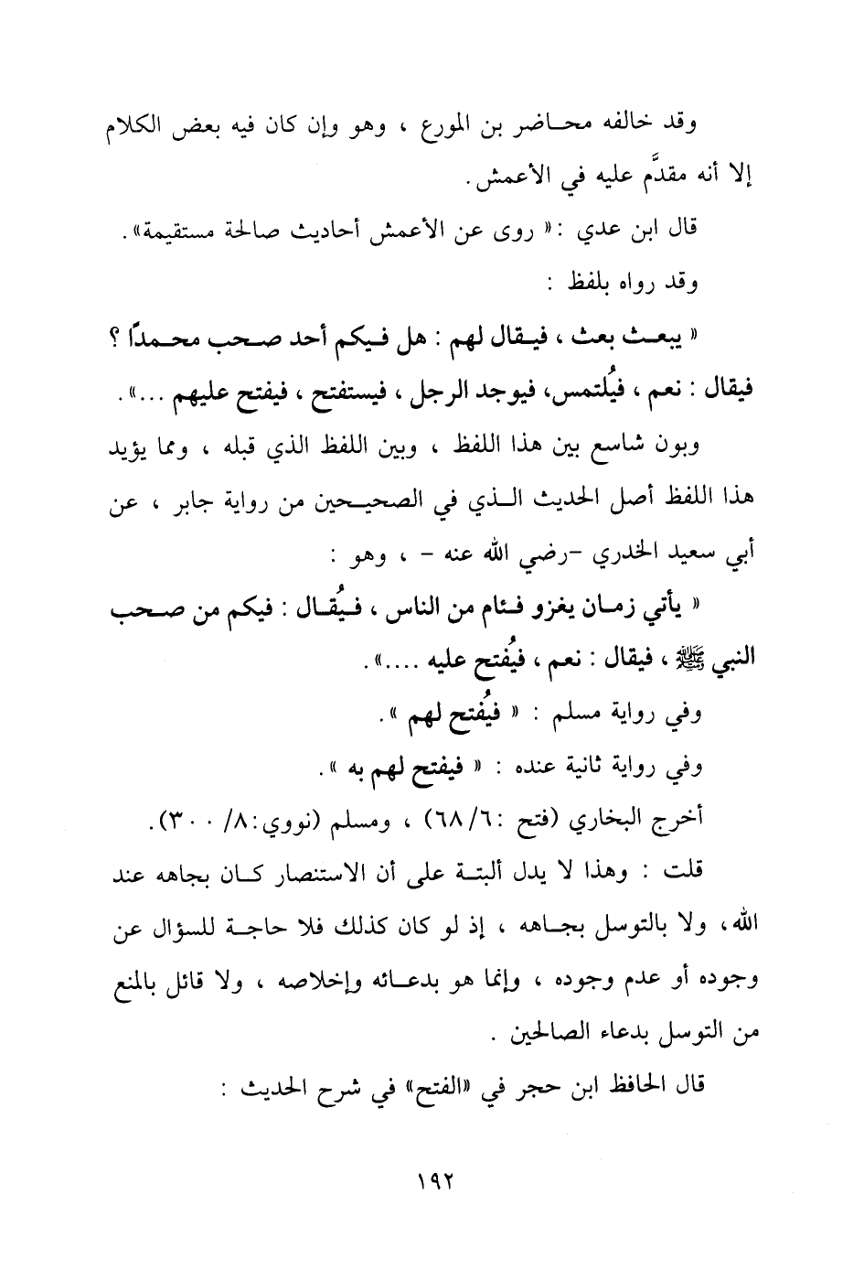 قلت: وهذا لا يدل ألبتة على أن الاستنصار كان بجاهه عند الله، ولا بالتوسل بجاهه، إذ لو كان كذلك فلا حاجة للسؤال عن وجوده أو عدم وجوده، وإنما هو بدعائه وإخلاصه، ولا قائل بالمنع من التوسل بدعاء الصالحين.