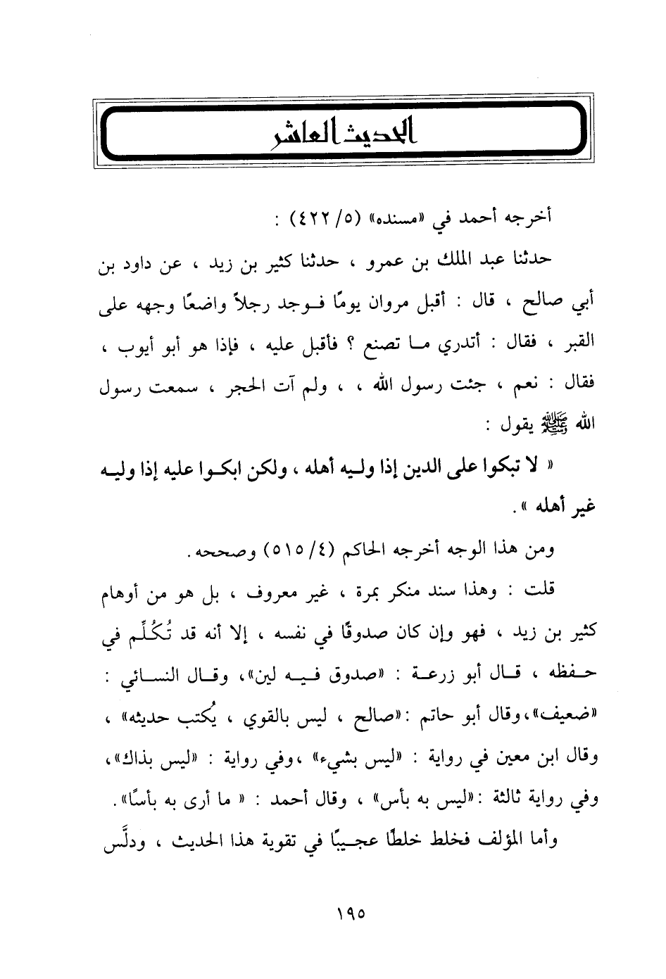 حدثنا عبد الملك بن عمرو، حدثنا كثير بن زيد، عن داود بن أبي صالح، قال: أقبل مروان يومًا فوجد رجلًا واضعًا وجهه على القبر، فقال: أتدري ما تصنع؟ فأقبل عليه، فإذا هو أبو أيوب، فقال: نعم، جئت رسول الله، ولم آت الحجر، سمعت رسول الله - صلى الله عليه وسلم - يقول: