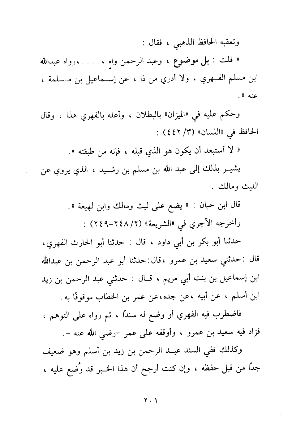 فاضطرب فيه الفهري أو وضع له سندًا، ثم رواه على التوهم، فزاد فيه سعيد بن عمرو؛ وأوقفه على عمر - رَضِيَ اللَّهُ عَنْهُ -.