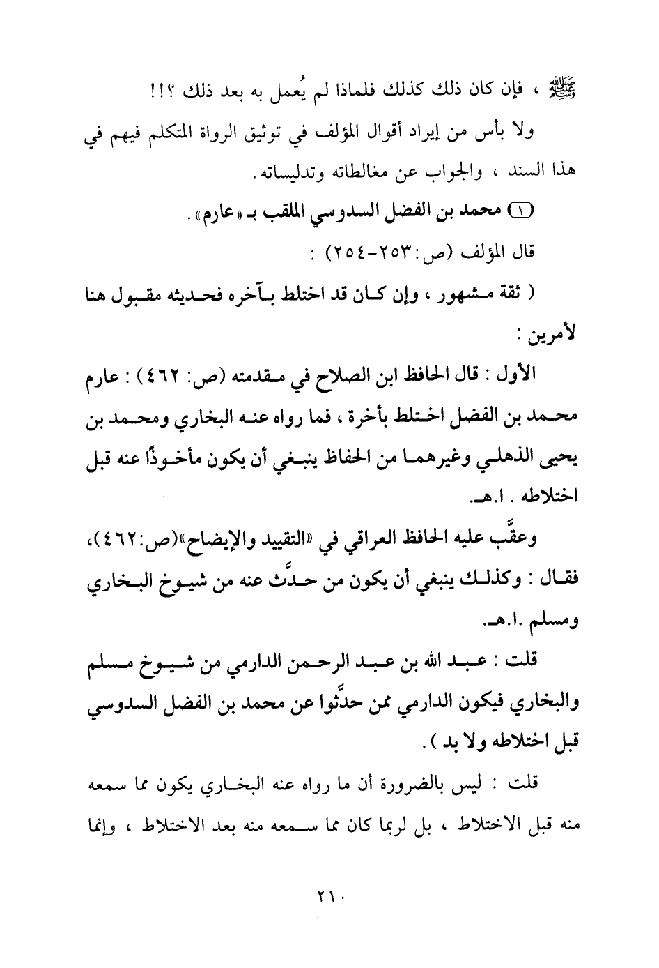 الأول: قال الحافظ ابن الصلاح في مقدمته (ص: ٤٦٢): عارم محمد بن الفضل اختلط بأخرة، فما رواه عنه البخاري ومحمد بن يحيى الذهلي وغيرهما من الحفّاظ ينبغي أن يكون مأخوذًا عنه قبل اختلاطه. ا. هـ.