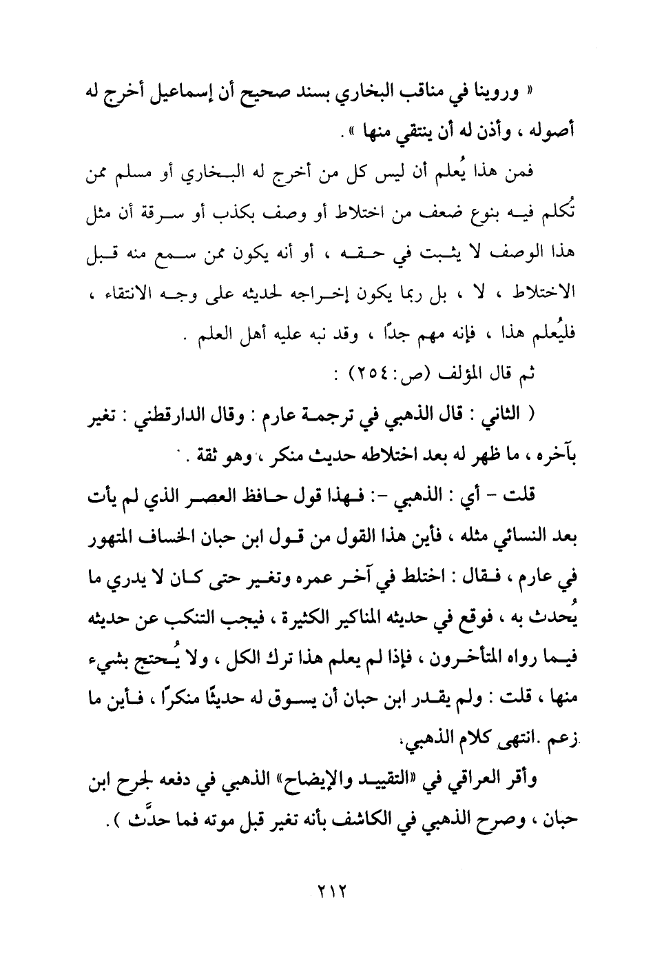قلت - أي: الذهبي -: فهذا قول حافظ العصر الذي لَمْ يأت بعد النسائي مثله، فأين هذا القول من قول ابن حبان الخساف المتهور في عارم، فقال: اختلط في آخر عمره وتغير حتى كان لا يدري ما يُحدث به، فوقع في حديثه المناكير الكثيرة، فيجب التنكب عن حديثه فيما رواه المتأخرون، فإذا لَمْ يعلم هذا ترك الكل، ولا يُحتج بشيء منها، قلت: ولم يقدر ابن حبان أن يسوق له حديثًا منكرًا، فأين ما زعم. انتهى كلام الذهبي.