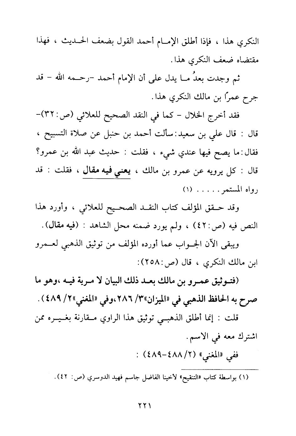 وقد حقق المؤلف كتاب النقد الصحيح للعلائي، وأورد هذا النص فيه (ص: ٤٢)، ولم يورد ضمنه محل الشاهد: (فيه مقال).