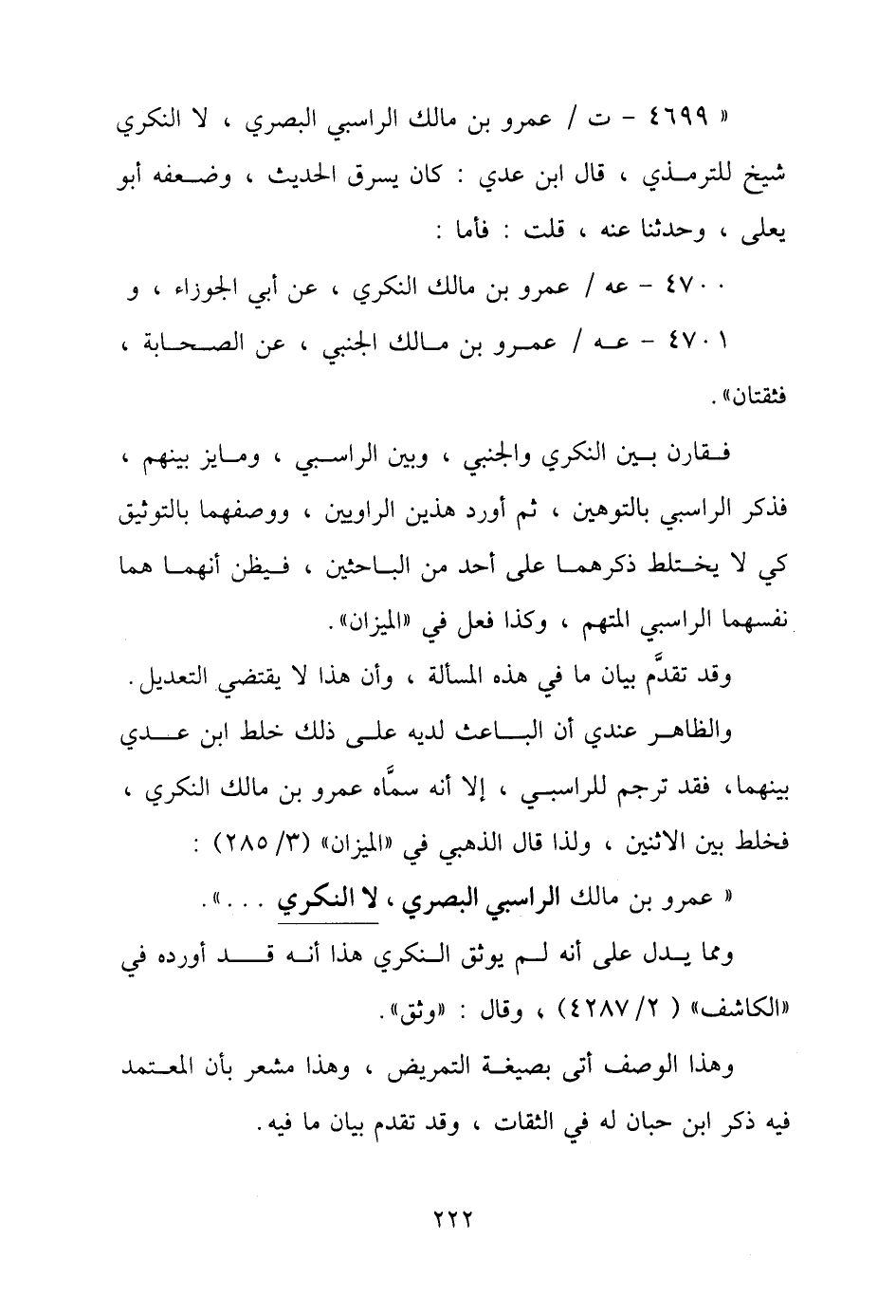 "٤٦٩٩ - ت / عمرو بن مالك الراسبي البصري، لا النكري شيخ للترمذي، قال ابن عديّ: كان يسرق الحديث، وضعفه أبو يعلى، وحدثنا عنه، قلت: فأما: