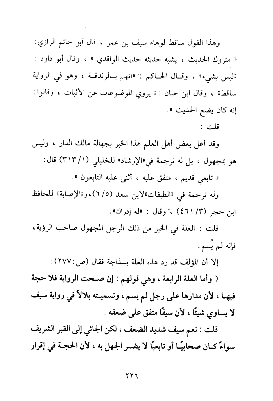 (وأما العلة الرابعة، وهي قولهم: إن صحت الرواية فلا حجة فيها، لأنَّ مدارها على رجل لَمْ يسم، وتسميته بلالًا في رواية سيف لا يساوي شيئًا، لأنَّ سيفًا متَّفقٌ على ضعفه.
