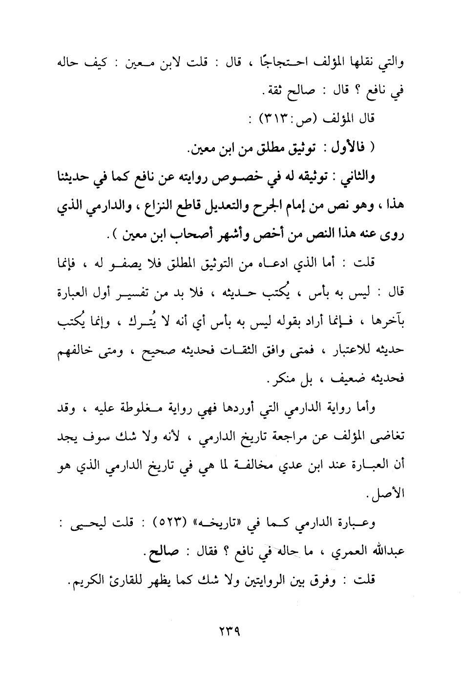 والثاني: توثيقه له في خصوص روايته عن نافع كما في حديثنا هذا، وهو نص من إمام الجرح والتعديل قاطع النزاع، والدارمي الذي روى عنه هذا النص من أخص وأشهر أصحاب ابن معين).