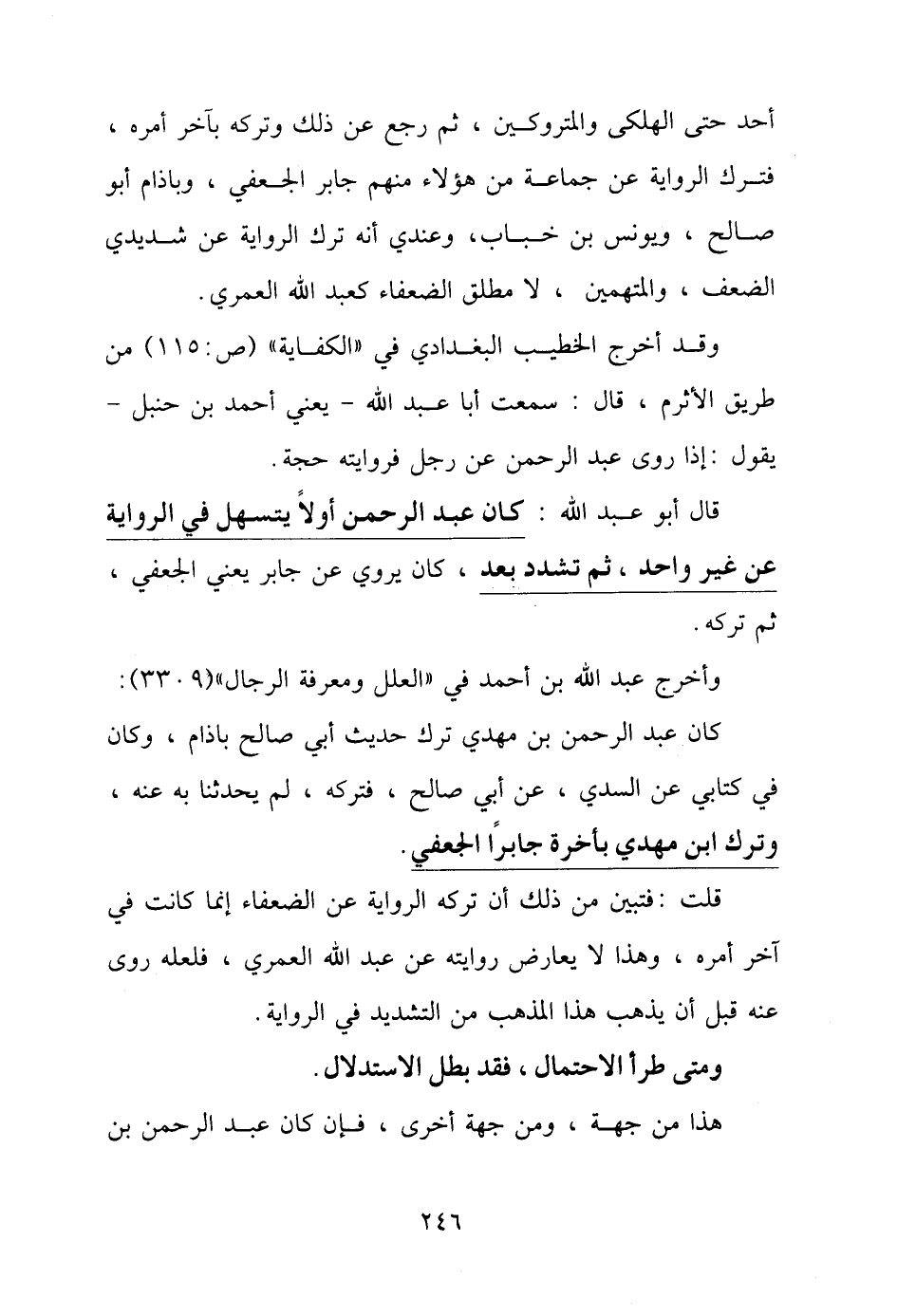أحد حتى الهلكى والمتروكين، ثم رجع عن ذلك وتركه بآخر أمره، فترك الرواية عن جماعة من هؤلاء منهم جابر الجعفي، وباذام أبو صالح، ويونس بن خباب، وعندي أنه ترك الرواية عن شديدي الضعف، والمتهمين، لا مطلق الضعفاء كعبد الله العمري.