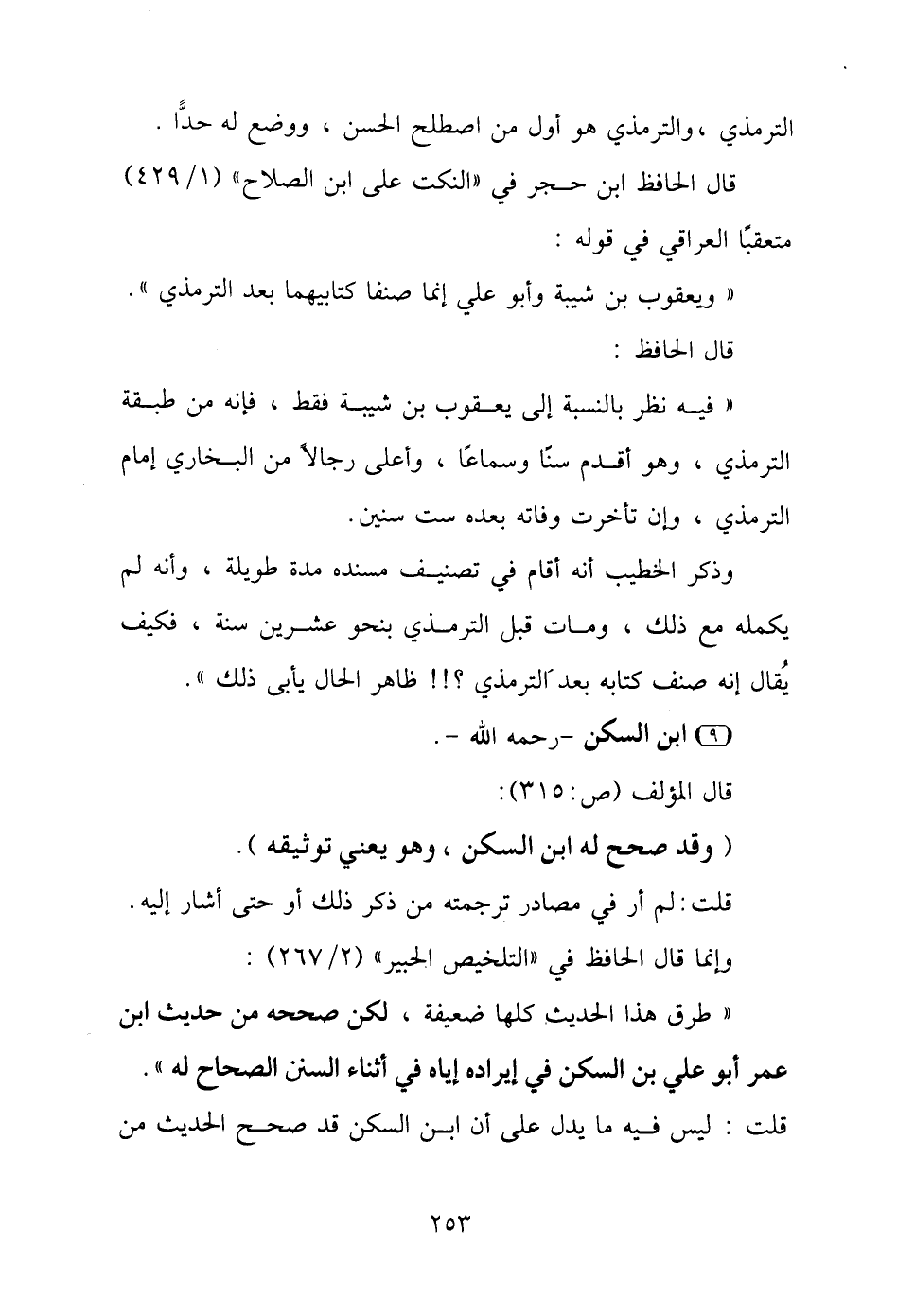 "فيه نظر بالنسبة إلى يعقوب بن شيبة فقط، فإنه من طبقة الترمذي، وهو أقدم سنًّا وسماعًا، وأعلى رجالًا من البخاري إمام الترمذي، وإن تأخرت وفاته بعده ست سنين.