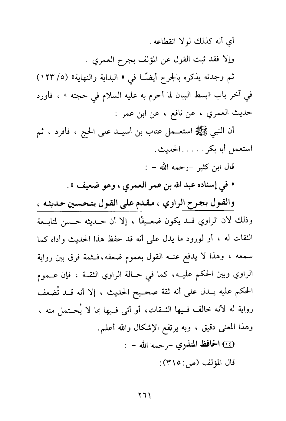 ثم وجدته يذكره بالجرح أيضًا في "البداية والنهاية" (٥/ ١٢٣) في آخر باب "بسط البيان لما أحرم به عليه السلام في حجته"، فأورد حديث العمري، عن نافع، عن ابن عمر: