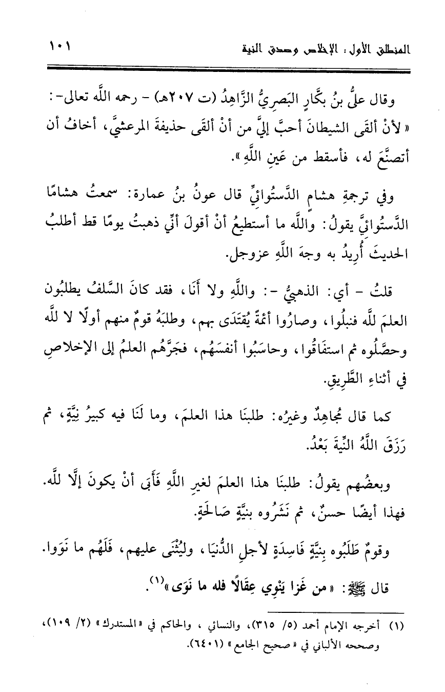 وفي ترجمة هشام الدستوائي قال عون بن عمارة: سمعت هشاما الدستوائي ... يقول: والله ما أستطيع أن أقول أنِّي ذهبت يومًا قط أطلب الحديث أريد به وجه الله عز وجل.