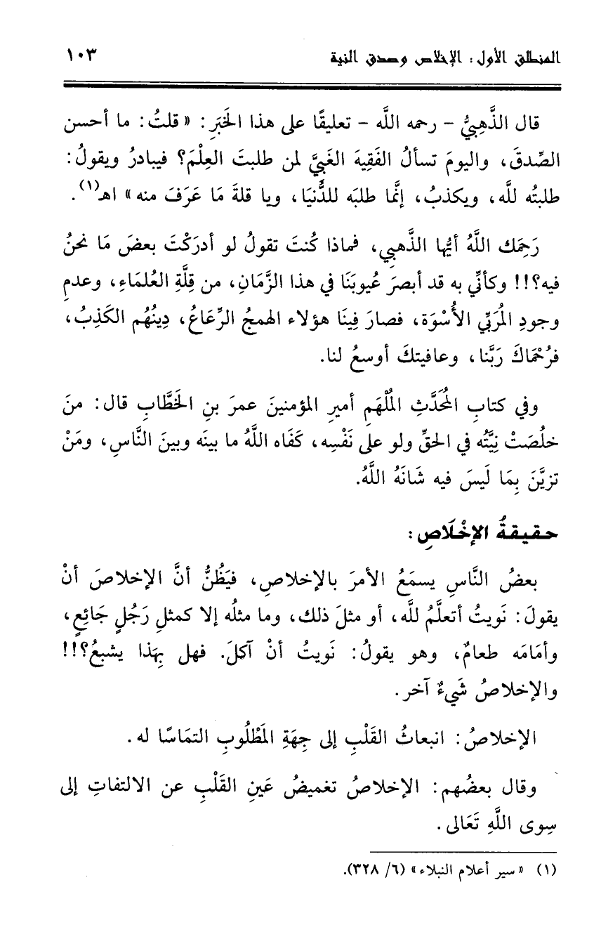 بعض الناس يسمع الأمر بالإخلاص، فيظن أنَّ الإخلاص أن يقول: نويت أتعلم لله، أو مثل ذلك، وما مثله إلا كمثل رجل جائع، وأمامه طعام، وهو يقول: نويت أن آكل. فهل بهذا يشبع؟!! الإخلاص شيء آخر، الإخلاص: انبعاث القلب إلى جهة المطلوب التماسًا.