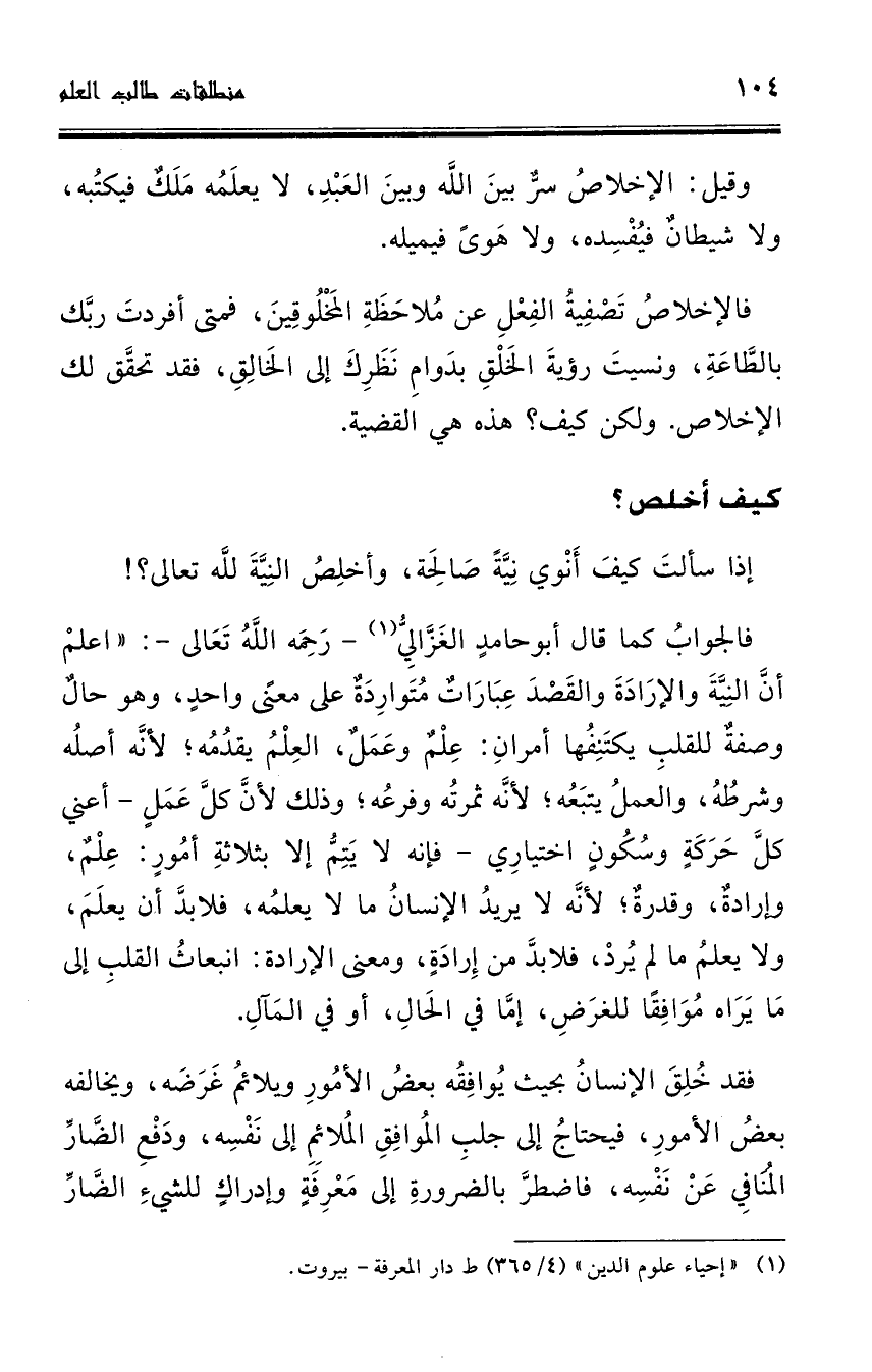 فالإخلاص تصفية الفعل عن ملاحظة المخلوقين، فمتى أفردت ربك بالطاعة، ونسيت رؤية الخلق بدوام نظرك إلى الخالق، فقد تحقق لك الإخلاص. ولكن كيف؟ هذه هي القضية.