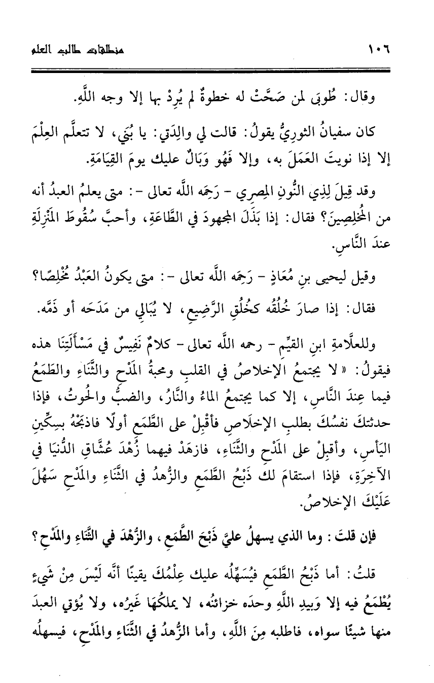 وللعلامة ابن القيم ـ رحمه الله تعالى ـ كلام نفيس في مسألتنا هذه فيقول: " لا يجتمع الإخلاص في القلب ومحبة المدح والثناء والطمع فيما عند الناس، إلا كما يجتمع الماء والنار، والضب والحوت، فإذا حَدَّثتك نفسك بطلب الإخلاص فأقبل على الطمع أولاً فاذبحه بسكين اليأس، وأقبل على المدح والثناء، فازهد فيهما زهد عشاق الدنيا في الآخرة، فإذا استقام لك ذبح الطمع والزهد في الثناء والمدح سهل عليك الإخلاص.