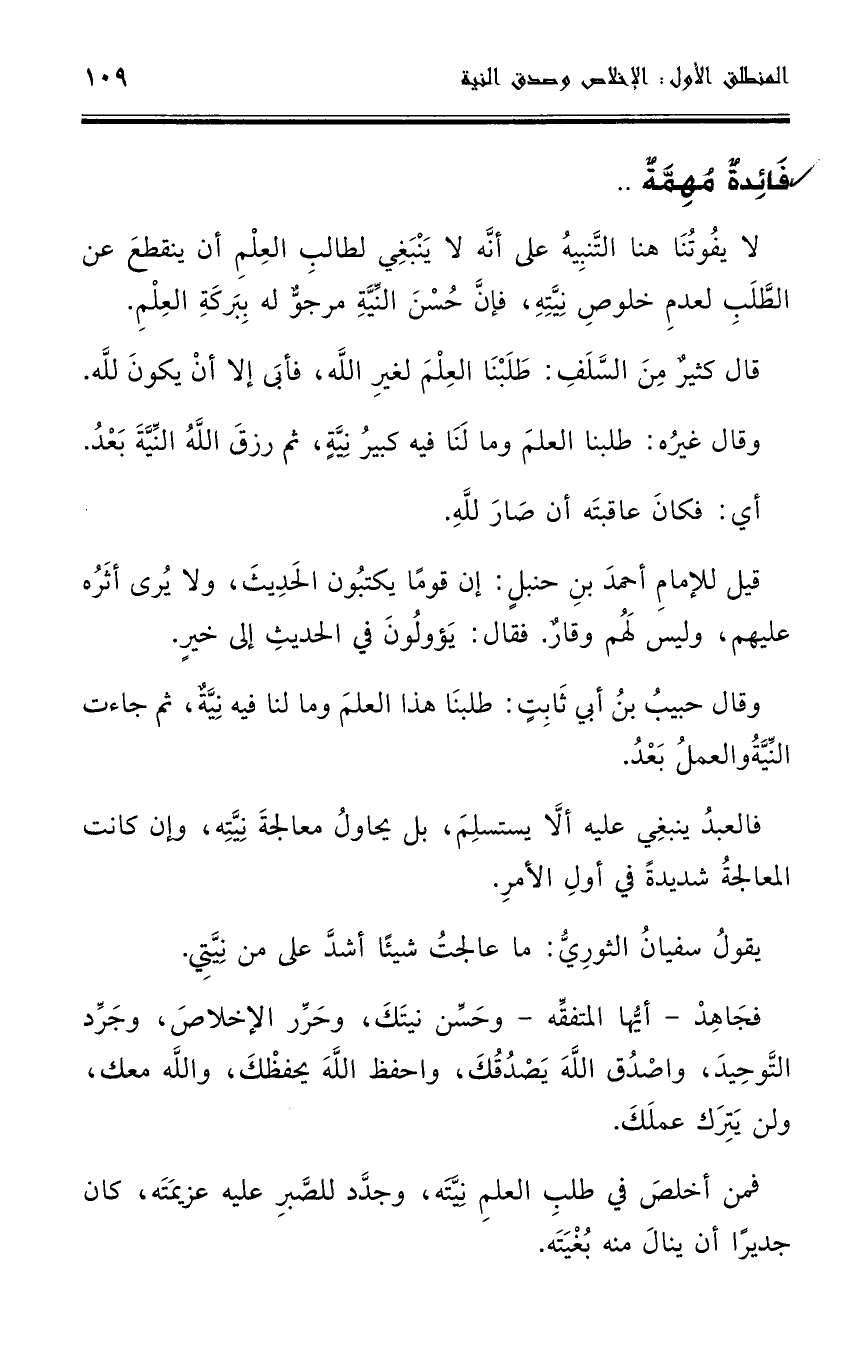 لا يفوتنا هنا التنبيه على أنه لا ينبغي لطالب العلم أن ينقطع عن الطلب لعدم خلوص نيته، فإن حسن النية مرجو له ببركة العلم.