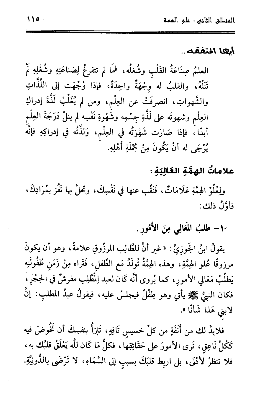 يقول ابن الجوزي: " غير أنَّ للطالب المرزوق علامة، وهو أن يكون مرزوقاً علو الهمة، وهذه الهمة تولد مع الطفل، فتراه من زمن طفولته يطلب معالي الأمور، كما يروى أنه كان لعبد المطلب مفرش في الحِجر، فكان النَّبي صلى الله عليه وسلم يأتي وهو طفل فيجلس عليه، فيقول عبد المطلب: إن لابني هذا شأناً.