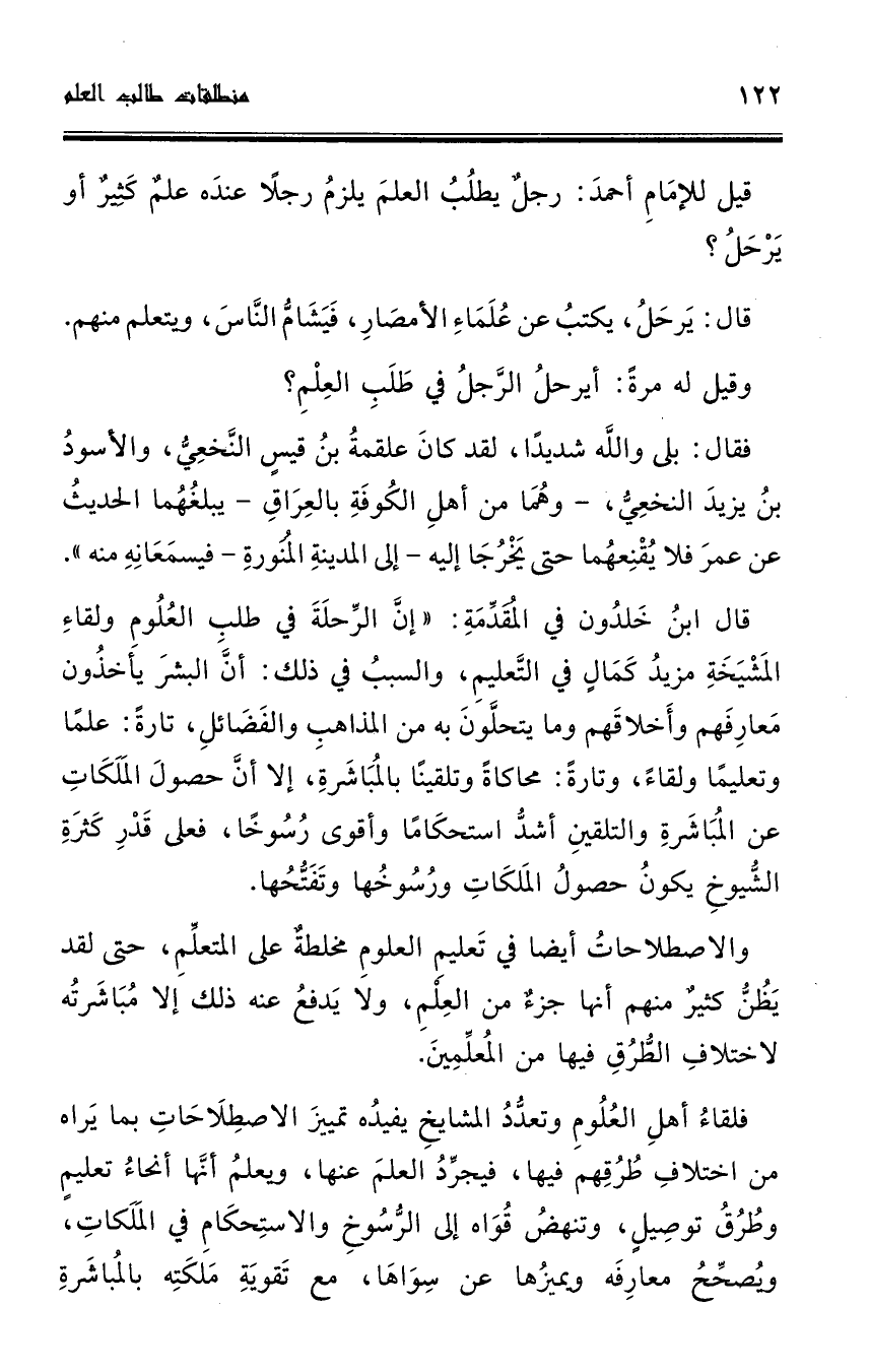 قال ابن خلدون في المقدمة: " إنَّ الرحلة في طلب العلوم ولقاء المشيخة: مزيد كمال في التعليم، والسبب في ذلك أنَّ البشر يأخذون معارفهم وأخلاقهم وما يتحلون به من المذاهب والفضائل، تارة: علمًا وتعليمًا ولقاءً. وتارةً: محاكاة وتلقينًا بالمباشرة. إلا أنَّ حصول الملكات عن المباشرة والتلقين، أشدُّ استحكامًا وأقوى رسوخًا، فعلى قدر كثرة الشيوخ يكون حصول الملكات ورسوخها ـ وتفتحها ـ