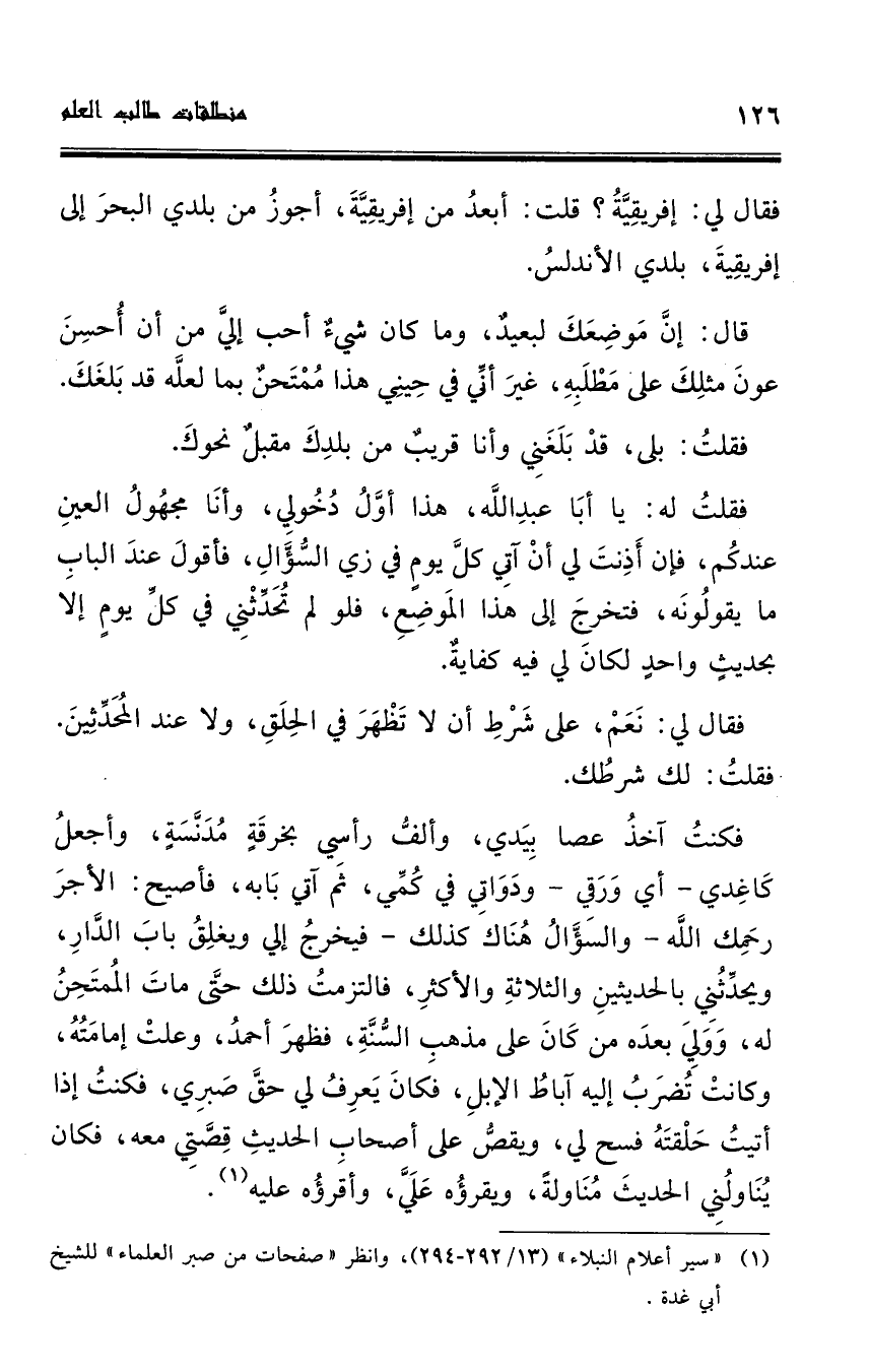 فقلت له: يا أبا عبد الله، هذا أول دخولي، وأنا مجهول العين عندكم، فان أذنت لي أن آتي كل يوم زي السؤال، فأقول عند الباب ما يقولونه، فتخرج إلى هذا الموضع، فلو لم تحدثني في كل يوم إلا بحديث واحد لكان لي فيه كفاية.