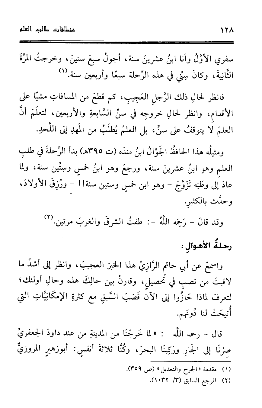 واسمع عن أبي حاتم الرازي هذا الخبر العجيب، وانظر إلى أشد ما لاقيت من نصب في تحصيل، وقارن بين حالك هذه وحال أولئك؛ لتعرف لماذا حازوا إلى الآن قصب السبق مع كثرة الإمكانيات التي أتيحت لنا دونهم.