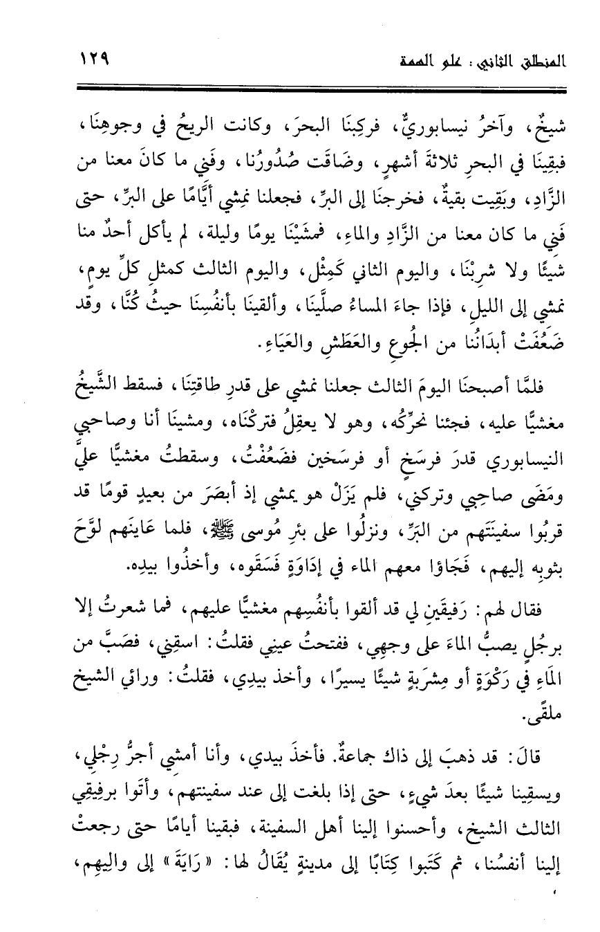 شيخ، وآخر نيسابوري، فركبنا البحر، وكانت الريح في وجوهنا، فبقينا في البحر ثلاثة أشهر، وضاقت صدورنا، وفني ما كان معنا من الزاد، وبقيت بقية، فخرجنا إلى البر، فجعلنا نمشي أيامًا على البر، حتى فني ما كان معنا من الزاد والماء، فمشينا يوماً وليلة، لم يأكل أحد منا شيئاً، ولا شربنا، واليوم الثاني كَمِثْل، واليوم الثالث كمثل كل يوم، نمشى إلى الليل، فإذا جاء المساء صلينا، وألقينا بأنفسنا حيث كنا، وقد ضعفت أبداننا من الجوع والعطش والعياء، فلما أصبحنا اليوم الثالث جعلنا نمشى على قدر طاقتنا، فسقط الشيخ مغشياً عليه، فجئنا نحركه، وهو لا يعقل فتركناه، ومشينا أنا وصاحبي النيسابورى قدر فرسخ أو فرسخين فضعفت، وسقطت مغشياً علىَّ ومضى صاحبي، وتركني فلم يزل هو يمشي إذ أبصر من بعيد قومًا قد قربوا سفينتهم من البر، ونزلوا على بئر موسى صلى الله عليه وسلم، فلما عاينهم لَوَّح بثوبه إليهم، فجاؤا معهم الماء في إداوة ... فسقوه، وأخذوا بيده.