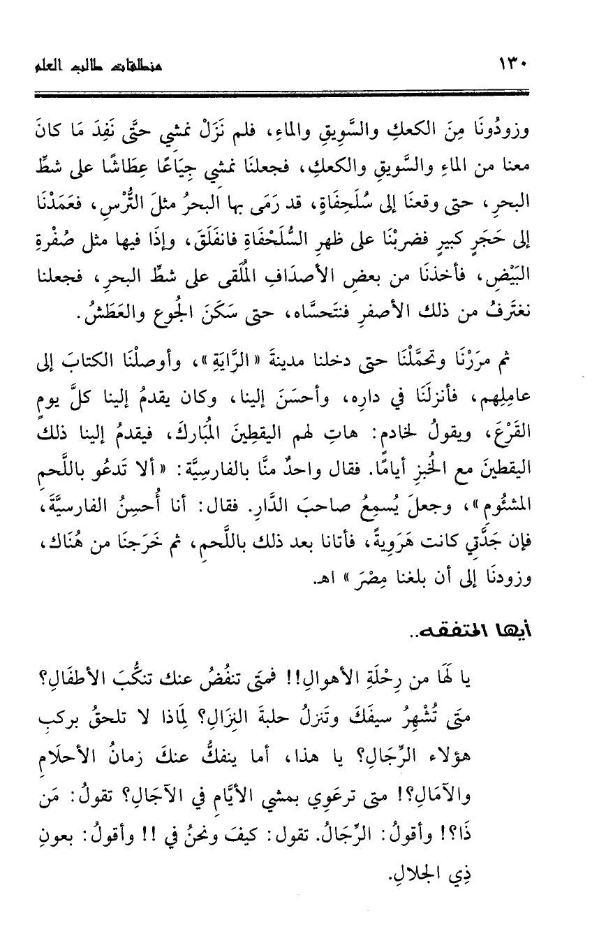 يا لها من رحلة الأهوال!! فمتى تنفض عنك تنكب الأطفال؟! متى تُشهر سيفك وتنزل حلبة النِّزال؟ لماذا لا تلحق بركب هؤلاء الرجال؟ يا هذا أما ينفك عنك زمان الأحلام والآمال!! متى ترعوي بمشي الأيام في الآجال؟ تقول: من ذا؟! وأقول: الرجال. تقول: كيف ونحن في ... !! وأقول: بعون ذي الجلال.