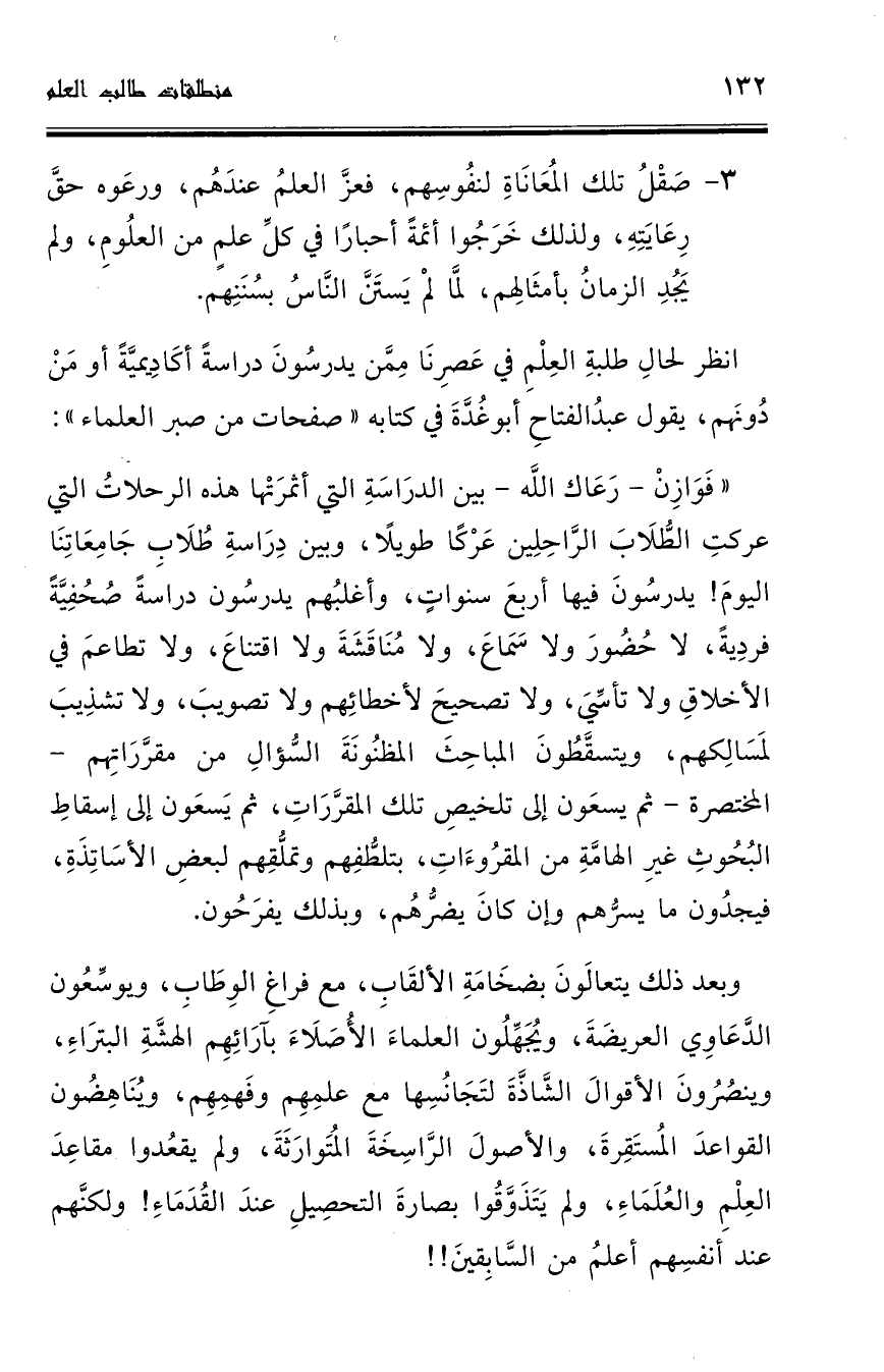 انظر لحال طلبة العلم في عصرنا ممَّن يدرسون دراسة أكاديمية أو من دونهم، يقول الشيخ عبد الفتاح أبو غدة ـ رحمه الله ـ: