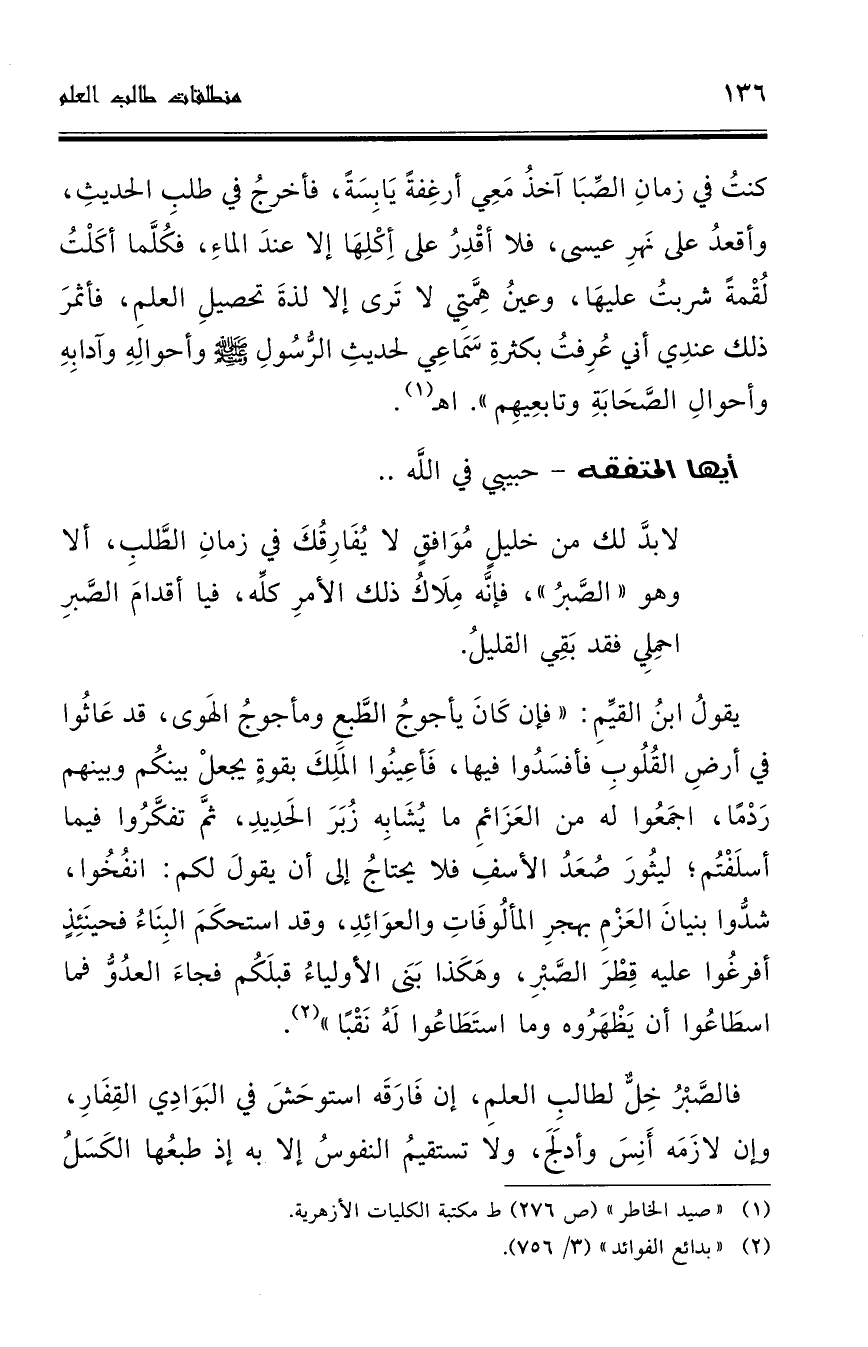 فالصبر خِلٌ لطالب العلم إن فارقه استوحش في البوادي القفار، وإن لازمه أنس وأدلج، ولا تستقيم النفوس إلا به إذ طبعها الكسل