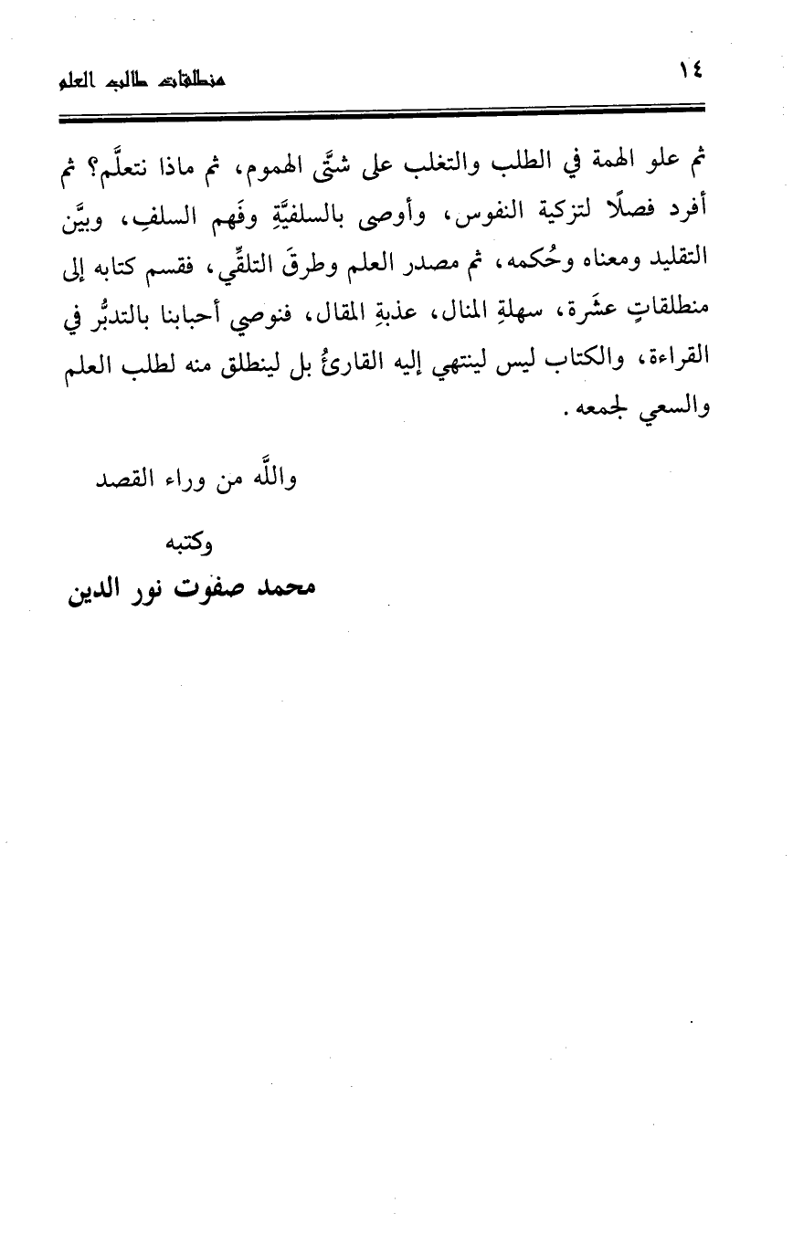 ثمَّ علو الهمة في الطلب والتغلب على شتى الهموم، ثمَّ ماذا نتعلم؟ ثمَّ أفرد فصلاً لتزكية النفوس، وأوصى بالسلفية وفهم السلف، وبيَّن التقليد ومعناه وحكمه، ثمَّ مصدر العلم وطرق التلقي، فقسَّم كتابه إلى منطلقات عشرة، سهلة المنال، عذبة المقال، فنوصي أحبابنا بالتدبر في القراءة، والكتاب ليس لينتهي إليه القارئ بل لينطلق منه لطلب العلم والسعي لجمعه.