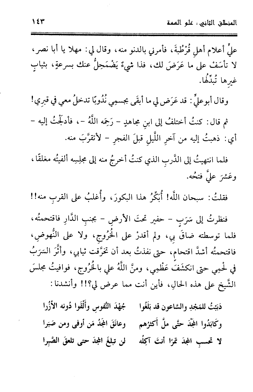 فنظرت إلى سرب ـ حفير تحت الأرض ـ بجنب الدار فاقتحمته، فلمَّا توسطته ضاق بي، ولم أقدر على الخروج، ولا على النهوض، فاقتحمته أشد اقتحام، حتى نفذت بعد أن تخرقت ثيابي واثَّر السرب في لحمي حتى انكشف عظمي، ومنَّ الله عليَّ بالخروج، فوافيت مجلس الشيخ على هذه الحال، فاين أنت مما عرض لي؟!! وأنشدنا: